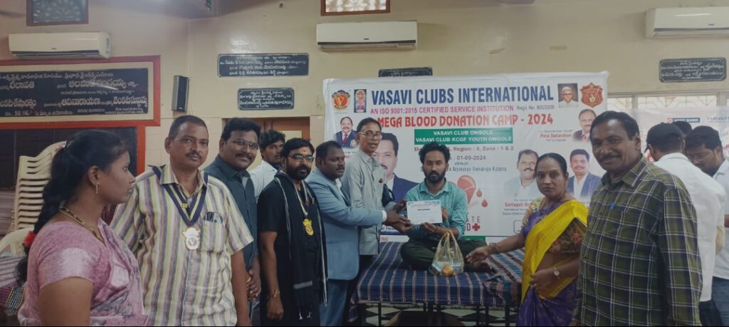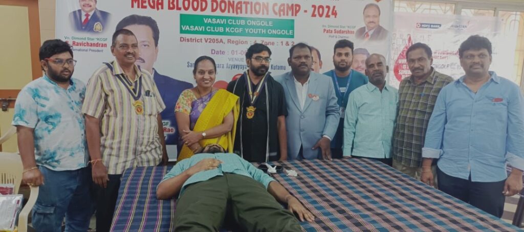 వాసవి క్లబ్ ఒంగోలు, వాసవి క్లబ్ కెసిజిఎఫ్ యూత్ ఒంగోలు వారు సంయుక్తంగా స్థానిక దక్షిణం బజారు లోని శ్రీ సంపత్ కుమార్ ఆర్యవైశ్య కళ్యాణ మండపంలో ఏర్పాటు చేసిన మెగా బ్లడ్ డొనేషన్ క్యాంపు కి ముఖ్య అతిథిగా విచ్చేసిన శిద్దా సూర్యప్రకాశరావు అక్కడ ఏర్పాటు చేసిన సమావేశంలో ప్రసంగించారు. వాసవిక్లబ్స్ ద్వారా ప్రతి సంవత్సరం కోట్లాది రూపాయల సేవాకార్యక్రమాలు జరుగుచున్నాయని, వాసవియన్ల సేవలు అనన్య సామాన్యంగా అభివర్ణించారు. ఈ వారోత్సవాలలో 2వ తేది కాలేజెస్, ఇన్టిట్యూషన్స్ లొ రక్తదాన శిబిరములు ఏర్పాటు చేసి విద్యార్ధులచే రక్తదాన ఉద్యమంలో భాగస్వాములను చేయడం, 3వతేది వృద్ధాశ్రమాలు అనాధాశ్రమాల్లో సేవలు, 4వ తేది మహిళలు యువతులకి సాధికారిక కార్యక్రమాలు, 5వ తేది ఉపాధ్యాయ దినోత్సవం సందర్భముగా గురువులను సన్మానించడం, 6వ తేది పాత్రికేయ దినోత్సవం సందర్భంగా పాత్రికేయుల సన్మానించడం, 7వ తేది శ్రేయోభిలాషి దాతలను సత్కరించడం జరుగుతుందని తెలిపారు. వాసవి జిల్లా 205 లో బ్లడ్ డొనేషన్ కార్యక్రమాల ఇంఛార్జ్ జి. బ్రహ్మానందం మాట్లాడుతూ జిల్లాలోని 60 క్లబ్స్ రక్తదాన శిబిరాలు ఏర్పాటు చేస్తున్నాయని, మూడు, నాలుగు రోజుల్లో గిన్నిస్ రికార్డు విషయం తెలుస్తుందని, ఆదివారం నగరంలోని క్లబ్స్ ఏర్పాటు చేసిన కార్యక్రమంలో నవ్య, విజన్ బ్లడ్ బ్యాంకుల సహకారంతో 70 యునిట్ల ను సేకరిండం జరిగినదని తెలిపారు, రక్తదాన ఆవశ్యకత పై ప్రసంగించారు.