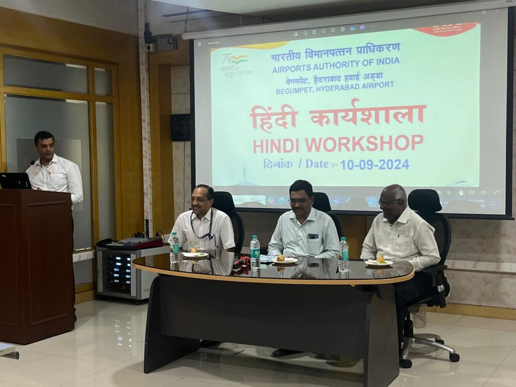 హిందీ భాషను ఉపయోగిస్తూ అధికారులు ఉద్యోగులను చైతన్య పరచడమే ఈ వర్క్ షాప్ ముఖ్య ఉద్దేశమని హైదరాబాద్ ఎయిర్ పోర్ట్ జనరల్ మేనేజర్, కోఆర్డినేషన్ ఇంచార్జ్ వి.వి రావు అన్నారు. మంగళవారం బేగంపేట విమానాశ్రయంలో ఏ ఏ ఐ ఆధ్వర్యంలో (ఎయిర్పోర్ట్స్ అథారిటీ ఆఫ్ ఇండియా) ఆధ్వర్యంలో వివిధ విభాగాల అధికారులు మరియు ఉద్యోగుల కోసం హిందీ వర్క్ షాప్ ను నిర్వహించారు .ఈ వర్క్ షాప్ ను ప్రారంభించిన ఎయిర్ పోర్ట్ జనరల్ మేనేజర్, కోఆర్డినేషన్ ఇంచార్జ్ వి.వి రావు మాట్లాడుతూ అధికార భాషకు సంబంధించిన నిబంధనల అమలులో శాకా ధిపతుల పాత్ర ఎంతో ముఖ్యమని అన్నారు. ఈ వర్క్ షాప్ తర్వాత శిక్షణ పొందిన అధికారులు తమ రోజువారి కార్యాలయ పనుల్లో హిందీని విరివిగా ఉపయోగిస్తారు అన్న నమ్మకాన్ని ఆయన వ్యక్తం చేశారు .వర్క్ షాప్ కు ముఖ్యఅతిథిగా హాజరైన భారత ప్రభుత్వ అధికార భాషా విభాగం హిందీ బోధన పథకం డిప్యూటీ డైరెక్టర్ (రిటైర్డ్) కమాలుద్దీన్ ను వి.వి రావు స్వాగతిస్తూ ఈ రంగంలో ఆయన అనుభవం మరియు స్ఫూర్తిదాయకమైన పనితీరు వల్ల ఈ వర్క్ షాప్ కు ఎంతో ప్రయోజనం కలుగుతుంది అన్నారు. కమాలుద్దీన్ మాట్లాడుతూ హిందీ పదజాలంపై వివరించారు .శుక్లా ఉపేంద్ర కుమార్ మాట్లాడుతూ హిందీలో పనిచేయడం ద్వారా ఈ పథకాల నుంచి ప్రయోజనం పొందవచ్చని అన్నారు. హిందీ పక్షోత్సవాల సందర్భంగా నిర్వహించే వివిధ పోటీలను గురించి రీసెర్చ్ జాయింట్ జనరల్ మేనేజర్ అపూర్వ జెన్ తెలియజేశారు. ఈ కార్యక్రమంలో కమ్యూనికేషన్స్ జాయింట్ జనరల్ మేనేజర్ బి రవిబాబు ఇన్ఫర్మేషన్ టెక్నాలజీ జనరల్ మేనేజర్ నీతా సురేష్ వివిధ విభాగాలకు చెందిన 29 మంది అధికారులు పాల్గొని శిక్షణ పొందారు.