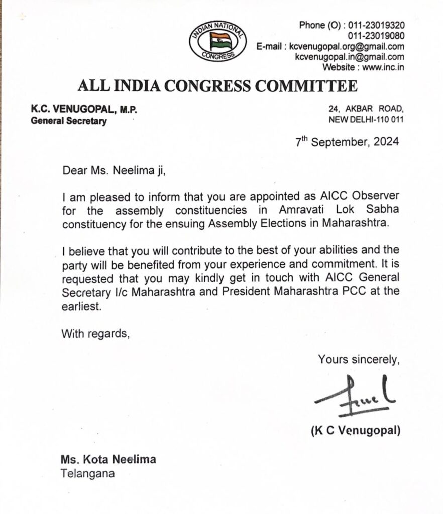 మహారాష్ట్రలోని అమరావతి జిల్లా లోకసభ పరిధిలోని అసెంబ్లీ నియోజకవర్గాలకు ఏఐసిసి పరిశీలకు రాలీగా ఏఐసీసీ సభ్యురాలు, తెలంగాణ ప్రదేశ్ కాంగ్రెస్ కమిటీ ప్రధాన కార్యదర్శి, సనత్ నగర్ నియోజకవర్గం కాంగ్రెస్ పార్టీ ఇంచార్జ్ డాక్టర్ కోట నీలిమ నియమితులయ్యారు. హిమాచల్ ప్రదేశ్ ఎన్నికల విజయంలో కీలకపాత్ర పోషించిన డాక్టర్ కోట నీలిమ నిబద్దతను దృష్టిలో ఉంచుకొని ఏఐసిసి ఆమెను మహారాష్ట్రలో రాబోయే అసెంబ్లీ ఎన్నికల పరిశీలకు రాలిగా నియమిస్తూ ఆల్ ఇండియా కాంగ్రెస్ కమిటీ ప్రధాన కార్యదర్శి, ఎంపి కే.సి వేణుగోపాల్ నియామక ఉత్తర్వులు ఇచ్చారు. ఆమె అనుభవం మహారాష్ట్రలో రానున్న ఎన్నికల్లో కాంగ్రెస్ పార్టీ