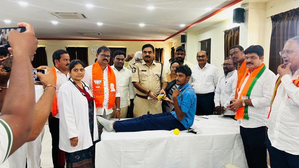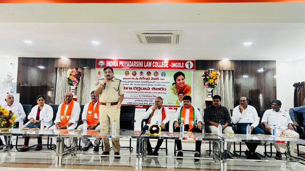 ప్రధానమంత్రి నరేంద్రమోదీ జన్మదినాన్ని పురష్కరించుకుని గురువారం బిజేపి యువమోర్చా జిల్లా అధ్యక్షుడు పువ్వాడి దామోదర్, రాష్ట్ర కార్యవర్గ సభ్యుడు కొమ్మి నరసింహారావు ఆధ్వర్యంలో ఇందిరా ప్రియదర్శిని లా కళాశాలలో రక్తదాన శిబిరాన్ని నిర్వహించారు. క్విజ్ కాలేజి విద్యార్థులు, లా కళాశాల విద్యార్థులు, యువ మోర్చా నాయకులు శిబిరంలో రక్తదానం చేసారు. ఆడిషనల్ ఎస్పీ శ్రీధరరావు ముఖ్య అతిథిగా పాల్గొని శిబిరాన్ని ప్రారంభించారు. జిల్లా బిజేపి అధ్యక్షుడు పీవీ శివా రెడ్డి, డాక్టర్ సెల్ కార్యవర్గ సభ్యుడు కొమ్మి నరసింహారావు, జిల్లా ఇన్చార్జి రవి శంకర్, బాపట్ల జిల్లా ఇన్చార్జి క్రిష్ణా రెడ్డి, ఒంగోలు నియోజక వర్గ ఇన్చార్జి వైసీ యోగయ్య యాదవ్, సురేష్, నాయక్, రాము, శ్రీనివాసరావు, రామక్రిష్ణ, మహేష్ తదితరులు పాల్గొన్నారు.