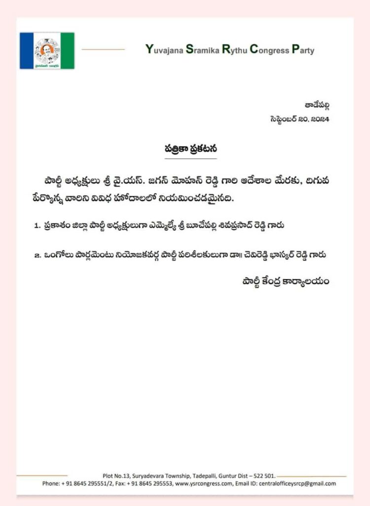 వైఎస్సార్సీపీ కుటుంబానికి అత్యంత విధేయులుగా వ్యవహరిస్తూ ఆ కుటుంబాన్ని నమ్ముకొని కష్టకాలంలో సైతం మాజీ సీఎం వైఎస్ జగన్ వెంట సుదీర్ఘ కాలం నడిచిన బూచేపల్లి కుటుంబ సేవలకు గుర్తింపుగా ప్రకాశం జిల్లా వైఎస్సార్సీపీ అధ్యక్షుడిగా దర్శి ఎమ్మెల్యే డాక్టర్ బూచేపల్లి శివ ప్రసాద్ రెడ్డిని, ఒంగోలు పార్లమెంటు నియోజకవర్గ పార్టీ పరిశీలకులుగా డాక్టర్ చెవిరెడ్డి భాస్కర్ రెడ్డి నియమిస్తూ పార్టీ అధ్యక్షుడు వైఎస్ జగన్మోహన్ రెడ్డి ఉత్తర్వులు జారీ చేసారు. ముందుగా తాడేపల్లిలో మాజీ సీఎం వైఎస్ జగన్మోహన్ రెడ్డితో జిల్లా పరిషత్ చైర్ పర్సన్ బూచేపల్లి వెంకాయమ్మ, డాక్టర్ చెవిరెడ్డి బాస్కర్ రెడ్డి, మాజీ మంత్రి ఆదిమూలపు సురేష్, యర్రగొండ పాలెం ఎమ్మెల్యే చంద్రశేఖర్, మాజీ ఎమ్మెల్యేలు కె నాగార్జున రెడ్డి, అన్నా రాంబాబు, కనిగిరి ఇన్చార్జి దద్దాల నారాయణలతో ప్రత్యేకంగా సమావేశమై చర్చించారు. అనంతరం జిల్లా పార్టీ అధ్యక్షులుగా డాక్టర్ బూచేపల్లి శివ ప్రసాద్ రెడ్డిని, పార్లమెంటు నియోజక వర్గ పరిశీలకులుగా చెవిరెడ్డి భాస్కర్ రెడ్డి నియమిస్తూ ఉత్తర్వులు వెలువడ్డాయి. పార్టీ అధ్యక్షులుగా ఎంపికఅయిన డాక్టర్ బూచేపల్లిని, చెవి రెడ్డిని ఎమ్మెల్యే చంద్రశేఖర్, మాజీ మంత్రి ఆదిమూలపు సురేష్, మాజీ ఎమ్మెల్యేలు, కాకుమాను రాజశేఖర్, మారెడ్డి సుబ్బా రెడ్డిను అభినందించారు. జిల్లా వ్వాప్తంగా, దర్శి నియోజక వర్గంలో డాక్టర్ బూచేపల్లికి జిల్లా అధ్యక్షుడిగా నియమించటం పట్ల వైఎస్సార్సీపీ శ్రేణులు, అభిమానులు హర్షం వ్యక్తం చేస్తున్నారు.