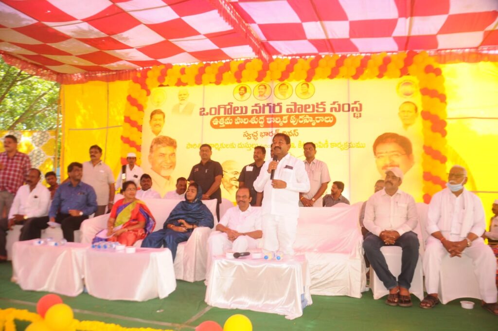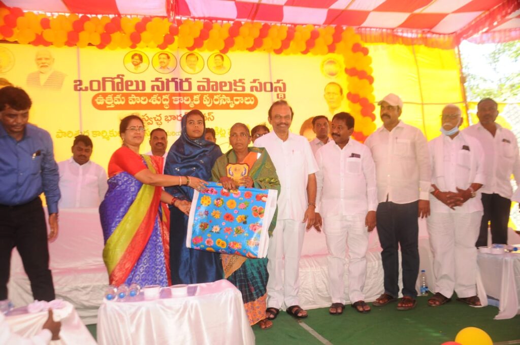 పరిసరాల పరిశుభ్రత కోసం నిరంతరం శ్రమిస్తున్న పారిశుద్ధ్య కార్మికులే సమాజంలో నిజమైన హీరోలు అని రాష్ట్ర సాంఘిక సంక్షేమ, దివ్యాంగులు వయోవృద్ధుల సంక్షేమ , సచివాలయాలు వాలంటీర్ల శాఖ మాత్యులు డోలా. శ్రీబాలవీరాంజనేయ స్వామి అన్నారు. బుధవారం ఒంగోలు మున్సిపల్ కార్యాలయ ప్రాంగణంలో నిర్వహించిన ఉత్తమ పారిశుధ్య కార్మిక పురస్కారాల ప్రదానోత్సవంలో ఆయన ముఖ్యఅతిథిగా పాల్గొన్నారు. మేయర్ గంగాడ సుజాత అధ్యక్షతన జరిగిన ఈ కార్యక్రమంలో పార్లమెంటు సభ్యులు మాగుంట. శ్రీనివాసులు రెడ్డి, జిల్లా కలెక్టర్ ఏ.తమీమ్ అన్సారియా కూడా పాల్గొన్నారు.