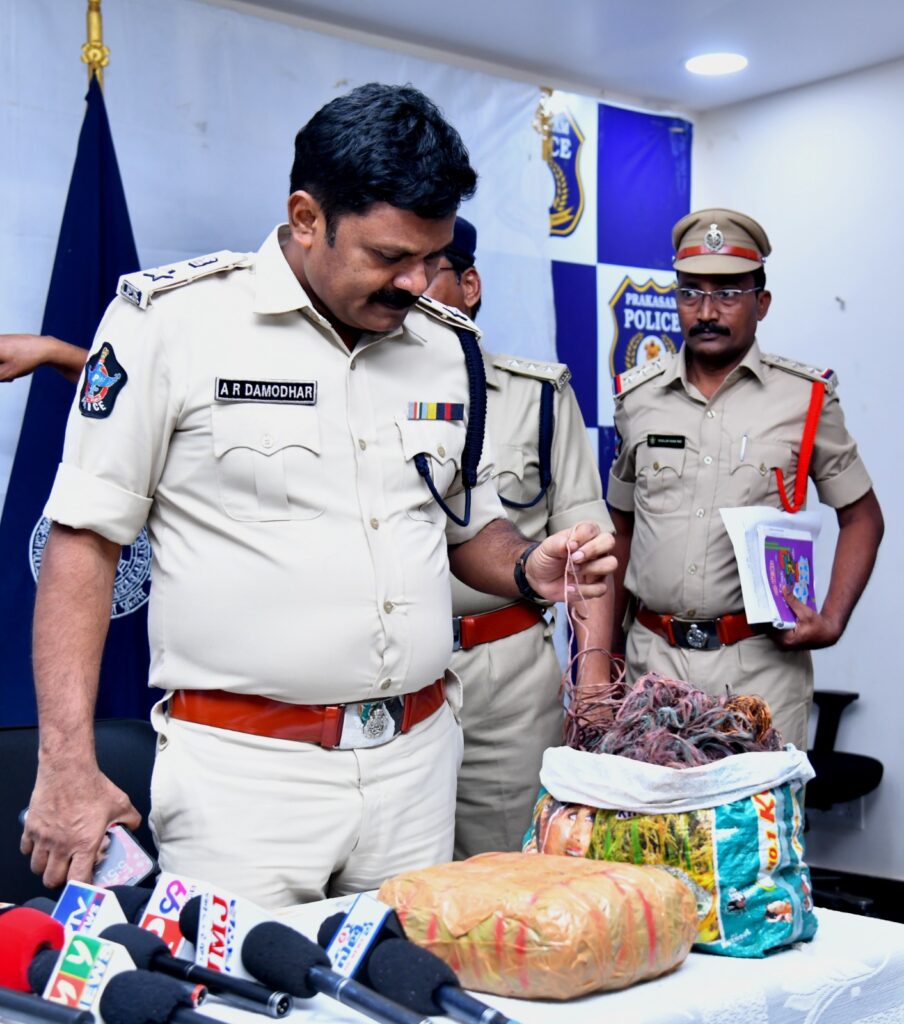 ట్రాన్స్ ఫార్మర్ లను పగలగొట్టి రాగి తీగలను దొంగతనం మరియు గంజాయి అమ్మే వ్యక్తులను ప్రకాశం జిల్లా పోలీసులు శుక్రవారం అరెస్టు చేసారు. వివరాలలోనికి వెలితే .. పోలీసుల తెలిపిన వివరాల ప్రకారం .. ప్రకాశం జిల్లా దర్శి ప్రాంతంలో తరుచుగా జరుగుతున్న ట్రాన్స్ఫరమ్స్ పగలగొట్టి అందులోనే రాగి తీగలను దొంగతనం చేస్తున్న దొంగలను గుర్తించి వారిపై కఠిన చర్యలు తీసుకోవాలని ఆదేశించినందున వారి ఉత్వరుల మేరకు దర్శి SDPO బి.లక్ష్మీనారాయణ ఆధ్వర్యంలో పోలీసు అధికారులు మరియు సిబ్బంది కలసి త్రీవ ప్రయత్నాలు చేస్తుండగా ఈ రోజు శుక్రవారం త్రిపురాంతం సీఐ అస్సన్ మరియు వారి సిబ్బందితో కురిచేడు ఏరియాలో తిరుగుతుండగా రాబడిన సమాచారం మేరకు ఈ దినం ఉదయం 11.30 కురిచేడు రైల్వే స్టేషన్ సమీపంలో పై తెలిపిన ముగ్గురు వ్యక్తులను అదుపులోకి తీసుకోని విచారించగా వారి వద్ద 1.5 Kg ల గంజాయిని స్వాధీనం చేసుకొని పూర్తి స్ధాయిలో విచారించగా వారు తాళ్లూరు, ముండ్లమూరు, దర్శి మరియు కురిచేడు పోలీస్ స్టేషన్లో జరిగిన ట్రాన్స్ ఫార్మర్ లను పగలగొట్టి అందులోని రాగి తీగను దొంగలించినట్లు ఒప్పుకున్నారు.ఆరు కేసులకు సంబందించిన సుమారు 16 KG ల రాగి తీగను స్వాధీనం చేసుకోవటం జరిగినది.