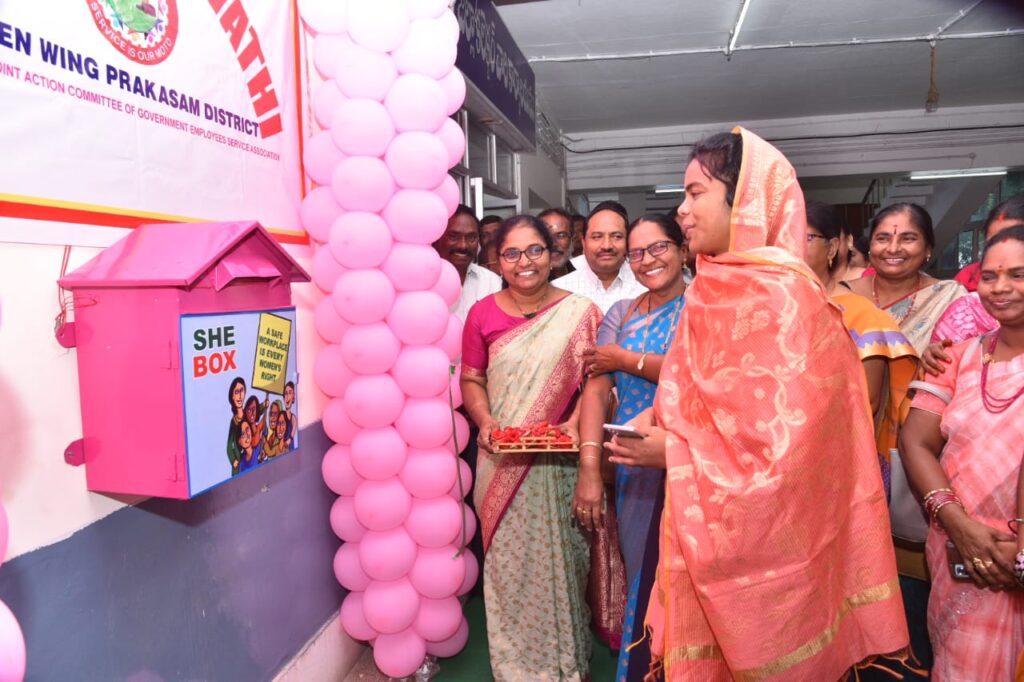 తొలుత లైంగిక వేధింపుల నిరోధక (PoSH) చట్టం అమలులో బాగంగా ఆంధ్రప్రదేశ్  జాయింట్ యాక్షన్ కమిటీ  అమరావతి జిల్లా మహిళా విభాగం ఆధ్వర్యంలో కలెక్టరేట్ లో  ఏర్పాటు చేసిన షీ బాక్స్  ( పిర్యాదుల బాక్స్) ను జిల్లా కలెక్టర్ త మీమ్ అన్సారియా ప్రారంభించారు.