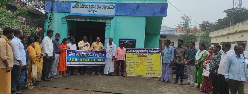 ప్రపంచ నేలల దినోత్సవంను తాళ్లూరు మండల వ్యవసాయాధికారి కార్యాలయంలో గురువారం నిర్వహించారు. వ్యవసాయాధికారి ప్రసాద రావు మాట్లాడుతూ భూమిలో పోషకాలను కాపాడాల్సిన బాధ్యత ప్రతి ఒక్కరి పై ఉందని అన్నారు. పోషకాల ప్రాముఖ్యతను వివరించారు. పశు వైద్యాధికారి డాక్టర్ ప్రతాప్ రెడ్డి మాట్లాడుతూ పశువులు, జీవాల ఎరువులు నెలలకు ఎంతో సారవంతమైనవని చెప్పారు. ఆత్మ బిటీఎం జ్యోతి భూసార పరీక్షల నిర్వహించి కార్డులను బట్టి ఎరువులను వాడాలని తెలిపారు. ఎఈఓ నాగరాజు, రైతులు పాల్గొన్నారు.