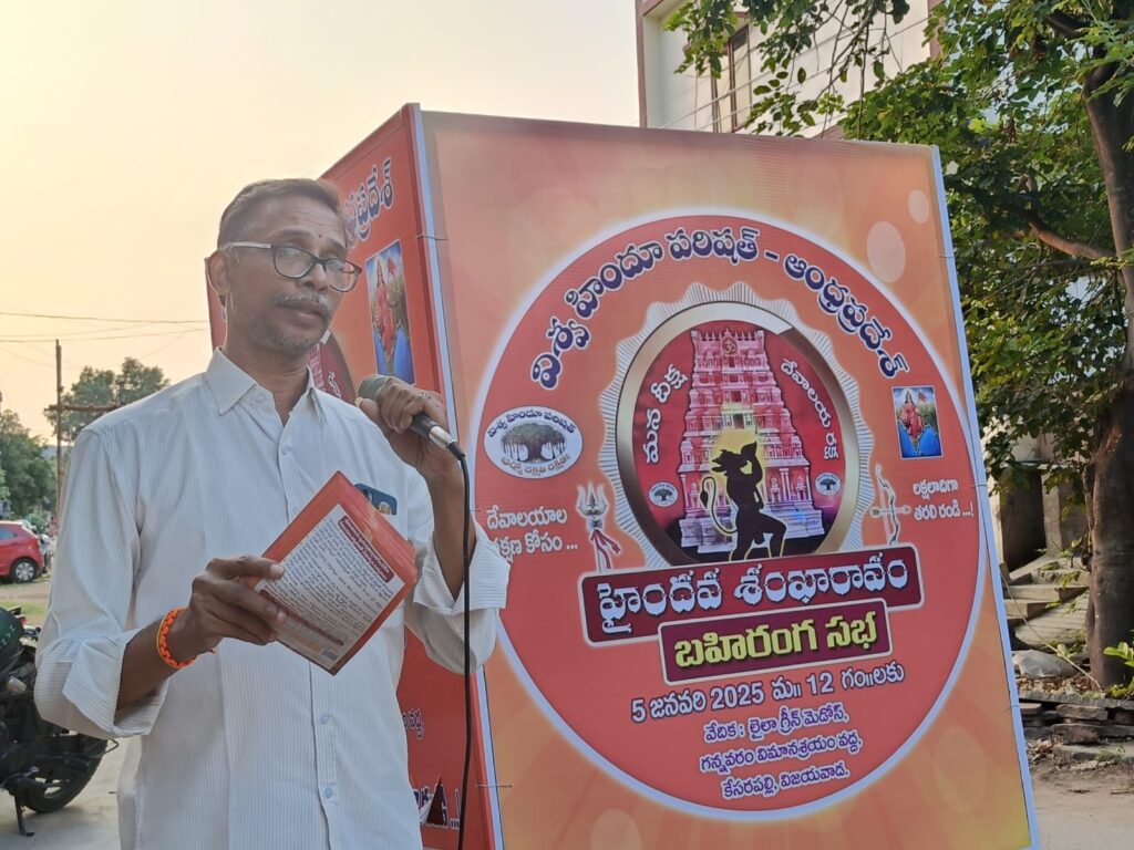 దేవాదాయ ధర్మాదాయ శాఖ పేరిట ప్రభుత్వం హిందూ దేవాలయాలపై చేస్తున్న పెత్తనాన్ని రద్దు చేయాలని, హిందూ దేవాలయాల్లో అన్యమతస్తులను తొలగించాలని, హిందూ దేవాలయాలను హిందువులే నిర్వహణ చేపట్టేలా ప్రభుత్వం చొరవ చూపాలని కోరుతూ… విశ్వహిందూ పరిషత్ ఆధ్వర్యంలో జనవరి 5వ తేదీన లక్షలాదిమంది హిందువుల తో హైందవ శంఖారావం పేరిట భారీ బహిరంగ సభ విజయవాడలో ఏర్పాటు చేసిందని కావున హిందూ బంధువులందరూ బహిరంగ సభలో పాల్గొని ప్రభుత్వానికి మన ఆకాంక్ష తెలిపే విధముగా శంఖారావమును వినిపిద్దామని జిల్లా విశ్వహిందూ పరిషత్ ప్రచార ప్రముఖు రాధా రమణ గుప్త జంధ్యం మరియు స్వయంసేవక్ నగర ప్రముఖ్ సింగోతు ఏడుకొండలు పిలుపునిచ్చారు.