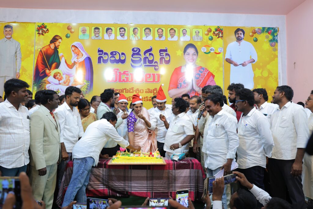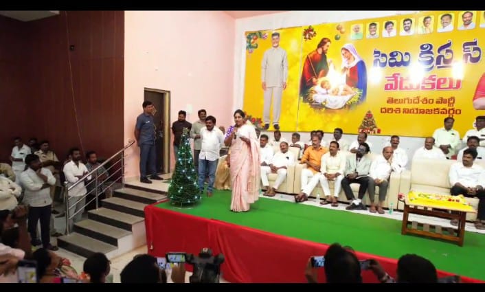 నాయకురాలుగా మీ వద్దకు రాలేదు మీలో ఒక సేవకురాలుగా నేను మీ ముందుకు వచ్చాను …….క్రిస్మస్ వేడుకల్లో పాల్గొనడం నాకు ఎంతో ఆనందంగా ఉందని క్రిస్మస్ పండుగను అందరూ ఘనంగా జరుపుకోవాలని ప్రతి కుటుంబం సంతోషాలతో విరజిల్లాలని ప్రభువు అందరిని దీవించి ప్రార్థిస్తాడని ఆమె తెలిపారు. ఆనందాన్ని పంచిపెట్టడంలో ఉన్న సంతృప్తి మరెక్కడా ఉండదన్నారు. అన్ని మతాలను, కులాలను గౌరవించి పేదలకు ఆకలిని తీర్చే పార్టీ తెలుగుదేశం పార్టీ అని ఆమె అభిప్రాయపడ్డారు. మన కూటమి ప్రభుత్వంలో ముఖ్యంగా మైనార్టీలకు ఒక రకమైన ధైర్యం, జీవితంపై భరోసా ఏర్పడిందన్నారు. గత ఐదేళ్లలో అల్పసంఖ్యాక వర్గాలు ఆకలి బాధలు, దౌర్జన్యాలు, దాడులతో బిగ్గుబిక్కుమని బతికారు అన్నారు. మన ప్రభుత్వం వచ్చిన తర్వాత పేదల అభ్యున్నతి ధ్యేయంగా పనిచేస్తున్నామన్నారు. ముఖ్యంగా పాస్టర్ల అభివృద్ధికి ప్రభుత్వం తగిన ప్రోత్సాహం ఇస్తుందన్నారు. ప్రజలందరూ సంతోషంగా ఉండడానికి ప్రభువు ఇచ్చిన జ్ఞానం మనకెంతో దోహద పడాలని కోరారు. ప్రియతమ ముఖ్యమంత్రి నారా చంద్రబాబునాయుడు , ఉపముఖ్యమంత్రి పవన్ కళ్యాణ్ , ఐటీ శాఖ మంత్రి నారా లోకేష్ సారథ్యంలో రాష్ట్రంలో అన్ని వర్గాల ప్రజలకు అభివృద్ధి సంక్షేమం అందుతుందని ఈ క్రిస్మస్ అభివృద్ధి క్రిస్మస్ గా జరుపుకోవాలని ఆమె ప్రజలకు పిలుపునిచ్చారు.