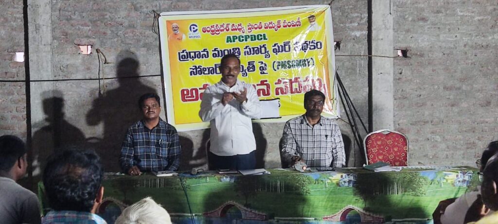 విద్యుత్తు వినియోగదారుల ప్రయోజనం కోసం కేంద్రప్రభుత్వం పిఎం సూర్యఘర్ ముఫ్ట బిజ్లి యోజన పథకంను ప్రవేశపెట్టిందని దర్శి విద్యుత్తు ఈఈ పాలగిరి శ్రీనివాసులు తెలిపారు. నాగంబొట్లపాలెం గ్రామంను పీఎం సూర్యఘర్ గా ఎంపిక చేయటంతో ప్రజల్లో ఈపధకం ప్రయోజనాలపై సోమవారం నాగంబొట్లపాలెం గ్రామంలో అవగాహన సదస్సు నిర్వహించారు. ఈ సందర్బంగా ఈఈ శ్రీనివాసులుమాట్లాడుతూ మద్యతరగతి విద్యుత్తు వినియోగదారులకు మూడు కేటగిరిలుగా విభజించి రాయితీ ఇస్తుందన్నారు. 0-150 యూనిట్లు 1-2 కిలో వాట్లు వాడుకునే వి నియోగదారులకు రూ. 30,000నుండి రూ.60000ల సబ్సీడీ, 150-300 యూనిట్లు 2-3 కిలోవాట్లువాడుకునే వినియోగదారులు రూ. 68,000 నుండి రూ. 78,000ల సబ్సీడీ, 300 యూనిట్లు 3 కిలోవాట్లు వాడుకునే వినియోగదారులకు రూ.78,000ల సబ్సీడీ ఇవ్వటం జరుగుతుందన్నారు. దరఖాస్తు చేయువినియోగదారులు 6నెలలకు తక్కవ కాకుండావిద్యుత్తు బిల్లులు జమచేయాలన్నారు. సోలార్ విద్యుత్తును తక్కువ ఖర్చుతో వినియోగించుకోవచ్చునన్నారు. 1కెవీ సోలార్ రూప్టాప్ ప్యానెల్ నెలకు దాదాపు125 యూనిట్లు ఉత్పత్తి చేస్తుందన్నారు. వినియోగదారులకు 5 నుండి 6సంవత్సరాల్లో మూల ధన వ్యవయాన్ని తిరిగి పొంద వచ్చునన్నారు. సోలార్ విద్యుత్తు వల్ల జరిగే ప్రయోజనాలనువివరించారు. మద్యతరగతి విద్యుత్తు వినియోగదారులు, రైతులు ఈ అవకాశాన్ని సద్వినియోగం చేసుకోవాలన్నారు. ఈ కార్యక్రమంలో దర్శి ఇంచార్జి విద్యుత్తు డీఈఈ డివీ కృష్ణారెడ్డి, ఏఈ వి.శ్రీనివాసరావు, లైన్ఇన్పెక్టర్ వివిఎస్ కాంతారావు, లైన్మెన్ వెంకటేశ్వర్లు, విద్యుత్తు వినియోగదారులు. రైతులు పాల్గొన్నారు.