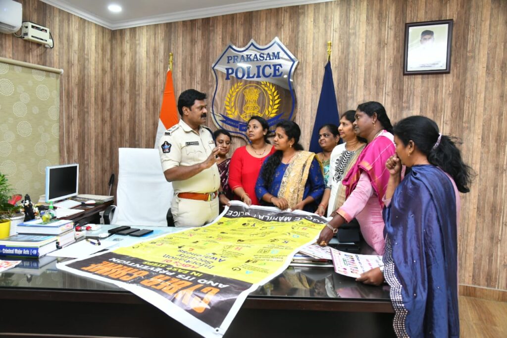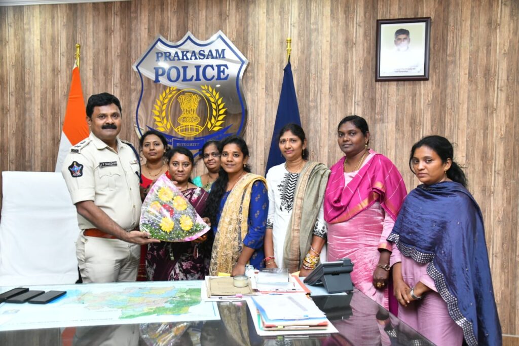 నూతన సంవత్సర వేడుకల్లో భాగంగా ప్రకాశం జిల్లా గ్రామ/వార్డు సచివాలయం మహిళా పోలీస్ అసోసియేషన్ వారు ప్రకాశం జిల్లా ఎస్పీ ఏఆర్ దామోదర్ ని గురువారం మర్యాదపూర్వకంగా కలిసి పుష్పగుచ్చం అందజేసి నూతన సంవత్సర శుభాకాంక్షలు తెలియజేశారు. అనంతరం ఎస్పీ చేతుల మీదగా నూతన సంవత్సరం క్యాలెండర్ ఆవిష్కరించారు. మహిళా పోలీస్ వారి విధులు మరియు సమస్యలను ఎస్పీ దృష్టికి తీసుకొని రాగా ఎస్పీ సానుకూలంగా స్పందించి పరిష్కారానికి కృషి చేస్తానన్నారు. సైబర్ క్రైమ్, గంజాయి వంటి మాదకద్రవ్యాలు, చిన్నారులపై జరిగే అకృత్యాలు వంటి ఎన్నో విషయాలు విస్తృతంగా ప్రజల్లో అవగాహన కల్పించడానికి చేపట్టాల్సిన కార్యచరణను దిశా నిర్దేశం చేసారు.