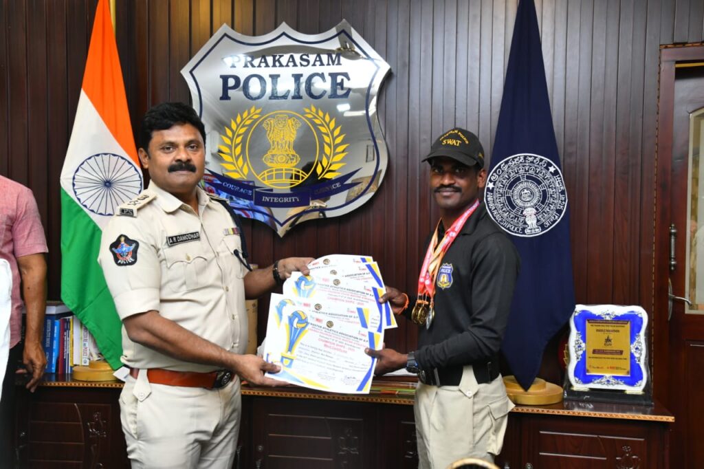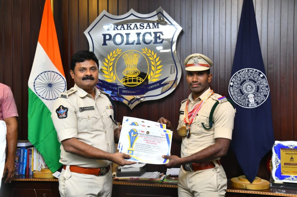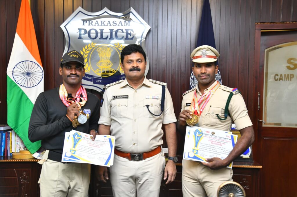 ఫిబ్రవరి 7, 8, 9 తేదీల్లో అనంతపురంలో రాష్ట్ర మాస్టర్ అథ్లెటిక్స్ పోటీలు నిర్వహించారు. ఈ పోటీల్లో ప్రకాశంజిల్లా పోలీస్ శాఖకు తరపున 30 ప్లస్ ఏజ్ గ్రూప్ విభాగంలో పోలీసులు వివిధ విభాగాలలో తమ ప్రతిభను చాటుకున్నారు. ఆంధ్రప్రదేశ్ రాష్ట్ర అథ్లెటిక్స్ పోటీల్లో పాల్గొని విశేష ప్రతిభ కనబరిచి పలు పతకాలు కైవసం చేసుకున్న ఆర్.ఎస్.ఐ సురేష్ మరియు కానిస్టేబుల్ ను జిల్లా ఎస్పీ ఏ. ఆర్ దామోదర్ ప్రత్యేకంగా అభినందించి సర్టిఫికెట్స్ మరియు మెడల్స్ ను ఎస్పీ అందచేసినారు. ఆంధ్రప్రదేశ్ రాష్ట్ర అథ్లెటిక్స్ పోటీలలో పతకాలు సాధించిన ఏ. ఆర్ విభాగంలో విధులు నిర్వహిస్తున్న ఆర్. ఎస్. ఐ సురేష్ 100m, 200M, లాంగ్ జంప్ 4x100m మరియు 4x 400M లో వరుసగా 4 గోల్డ్,1 సిల్వర్ మెడల్స్, 2) కె. శ్రీనివాసరావు(PC.973) 400m, 800M,4X100m, హై జంప్ మరియు 4X400m వరుసగా 4 గోల్డ్,1 సిల్వర్ మెడల్స్ సాధించారు.