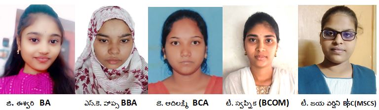 Bsc ( BZC ) విభాగంలో sk ఆశాభాను 863/900 మార్కులతో ప్రథమ స్థానాన్ని,B. అనూష 854/900 మార్కులతో ద్వితీయ స్థానాన్ని V. ఆశ్రియా 843/900 మార్కులతో మూడవ స్థానాన్ని సాధించారు. Bsc (BMC) విభాగంలో k చంద్రిక 856/900 మార్కులతో ప్రథమ స్థానాన్ని, M. ప్రణవి 848/900. మార్కులతో ద్వితీయ స్థానాన్ని, E. దేవికా సౌమ్య 840/900 మార్కు లతో తృతీయ స్థానాన్ని సాధించారు. బీఎస్సీ ( అగ్రికల్చర్) విభాగంలో k సింధుజ 825/900 మార్కులతో ప్రథమ స్థానాన్ని, p. వెంకటలక్ష్మి తిరుపతమ్మ 821/900 మార్కులతో ద్వితీయ స్థానాన్ని, B. సాయి ప్రసన్న 808/900 మార్కులతో తృతీయ స్థానాన్ని సాధించారు. BCA విభాగంలో J. ఆదిలక్ష్మి 840/900 మార్కులతో మొదటి స్థానాన్ని, U. అర్చన 825/900 మార్కులతో ద్వితీయ స్థానాన్ని, V. వెంకట స్వాతి 817/900 మార్కులతో తృతీయ స్థానాన్ని సాధించారు. BCOM విభాగంలో Y. స్వప్నిక 636/700 మార్కులతో ప్రథమ స్థానాన్ని, M. కౌసల్య 632/700 మార్కులతో ద్వితీయ స్థానాన్ని, B. యశోద లక్ష్మి 618/700 మార్కులతో తృతీయ స్థానాన్ని సాధించారు. BSC ( TMW) విభాగంలో G. పూజిత 829/900 మార్కులతో మొదటి స్థానాన్ని, G. లక్ష్మి 828/900 మార్కులతో ద్వితీయ స్థానాన్ని, BSC ( MPCS) విభాగంలో T. విజయలక్ష్మి 753/800 మార్కులతో ప్రథమ స్థానాన్ని, P. వైష్ణవి 749/800 మార్కులతో ద్వితీయ స్థానాన్ని, SK. అమీనా 746/800 మార్కులతో తృతీయ స్థానాన్ని సాధించారు. BSC ( MSCS) విభాగంలో T. జయ వర్షిని 769/800 మార్కులతో ప్రథమ స్థానాన్ని, A. వినీత 765/800 మార్కులతో ద్వితీయ స్థానాన్ని, G. లావణ్య 762/800 మార్కులతో తృతీయ స్థానాన్ని సాధించారు. BSC ( mccs,,) విభాగంలో G. లోకేశ్వరి 720/ 800 మార్కులతో మొదటి స్థానాన్ని, BSC ( ఆక్వా కల్చర్) విభాగంలో D. సునీల 791/900 మార్కులతో మొదటి స్థానాన్ని సాధించారు, G. త్రివేణి 789/900 మార్కులతో ద్వితీయ స్థానాన్ని సాధించారు. BBA విభాగంలో SK హప్స 519/600 , I. నందిని 519/600 మార్కులతో ప్రథమ స్థానాన్ని , P. సంతోష్ 505/600 మార్కులతో ద్వితీయ స్థానాన్ని సాధించారు. BA విభాగంలో గ్. ఈశ్వరి 487/600 మార్కులతో ప్రథమ స్థానాన్ని, K.A పాల్ 486/600 మార్కులతో ద్వితీయ స్థానాన్ని, sk దినేష్ యామిన్ 482/600 మార్కులతో శృతి స్థానాన్ని సాధించారు. ఈ సందర్భాన్ని పురస్కరించుకొని కళాశాలలో జరిగిన అభినందన కార్యక్రమంలో కళాశాల చైర్మన్ గోరంట్ల రవికుమార్ , సెక్రటరీ అండ్ కరెస్పాండెంట్ గోరంట్ల కవిత , డిగ్రీ కళాశాల ప్రిన్సిపల్ దాది ఆంజనేయులు , పీజీ కోఆర్డినేటర్ శ్రీనివాసులు రెడ్డి , AO యాంకర్ శ్రీనివాసరావు మరియు ఇతర అధ్యాపక అధ్యాపకేతర సిబ్బంది పాల్గొని విద్యార్థినీ విద్యార్థులకు అభినందనలు తెలియజేశారు.