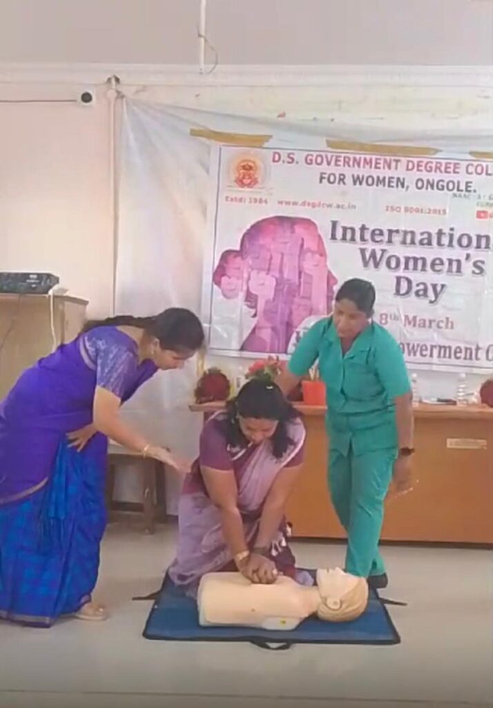 కార్యక్రమంలో బిజేపి మహిళా మోర్చాా జిల్లా ప్రధాన కార్యదర్శి బి. విజయరావు నమూనా పై ప్రయోగాత్మకంగా సిపిఆర్ నిర్వహించారు. కార్యక్రమంలో భారతీయ జనతా పార్టీ జిల్లా ప్రధాన కార్యదర్శి విజయరావు. జిల్లాకార్యదర్శి, మహిళా మోర్చా జిల్లా ఇన్చార్జి తీగల సత్యవతి, కార్యవర్గ సభ్యురాలు ధనిశెట్టి పావని, ఒంగోలు మండల అధ్యక్షురాలు దేవరపల్లి శ్రీలక్ష్మి మరియు కళాశాల అధ్యాపకులు, విద్యార్ధినులు పాల్గొన్నారు.
