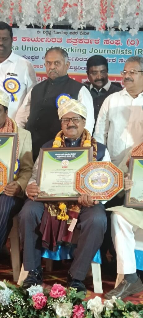సాక్షి సీనియర్ పాత్రికేయుడు, సాక్షి రిపోర్టర్ ఎన్. గురుశాంతను అసోసియేషన్ (కేయూడబ్ల్యూజే) విశేష అవార్డుతో సత్కరించింది. 2024-2025 సంవత్సరం గానూ కర్ణాటక వర్కింగ్ జర్నలిస్టుల సంఘం జర్నలిస్టులకు ప్రకటించిన ప్రత్యేక అవార్డుల ప్రదాన కార్యక్రమం కొప్పళ నగరంలో జరుగగా, బళ్లారికి చెందిన జర్నలిస్ట్ ఎన్. గురుశాంత కు విశేష ప్రశస్తితో సత్కరించారు. జర్నలిస్టుగా సుధీర్ఘ సేవలు అందించిన గురుశాంతను గుర్తించి ఈ అవార్డును రాష్ట్ర కన్నడ- సంస్కృతిక శాఖ మంత్రి, కొప్పళ జిల్లా ఇన్చార్జి మంత్రి శివరాజ్ తంగడిగి, ముఖ్యమంత్రి మీడియా సలహాదా రు కె.వి.ప్రభాకర్, కేయూడబ్ల్యూజే రాష్ట్ర అధ్యక్షులు శివానంద్ తగడూరు. ప్రధాన కార్యదర్శి లోకేష్, కొప్పళ ఎమ్మెల్యే రాఘవేంద్రహి ట్నాల్ తోపాటు పలువురు ప్రముఖు లు జర్నలిస్టు గురుశాంతను శాలువా కప్పి ప్రశస్తితో సన్మానం చేశారు. కర్ణాటక వర్కింగ్ జర్నలిస్టుల సంక్షేమానికి కృషిచేస్తుందని, సీనియర్ జర్నలిస్టులను, వారిసేవలను పరిగణ లోకి తీసుకుని ప్రతి సంవత్సరం అవార్డులను అందజేస్తున్నట్లు అధ్యక్షుడు శివానంద తగడూరు తెలిపారు. కన్నడ భాష పాత్రికేయులతోపాటు కర్ణాటకలో సుధీర్ఘకాలం సేవలందిస్తున్న తెలుగు పత్రికల జర్నలిస్టుల సేవల్ని గుర్తించి, అవార్డులతో సత్కరిస్తున్నట్లు పేర్కొన్నారు. ఈ సందర్భంలో రాష్ట్రంలోని వివిధ ప్రాంతాల నుంచి వచ్చిన జర్నలిస్టులతోపాటు సంఘం కమిటీ కార్యవర్గ సభ్యులు, జిల్లా సంఘం పదాధికారులు పాల్గొన్నారు.