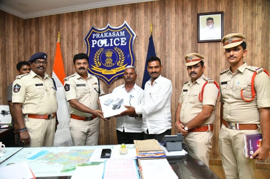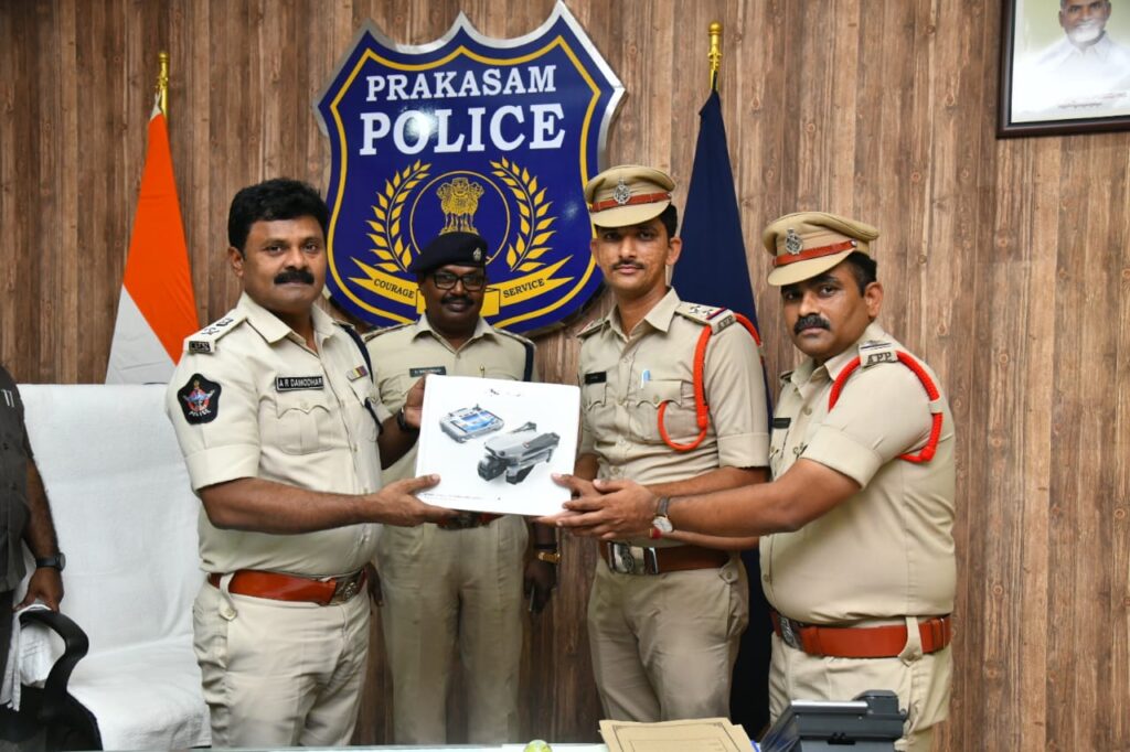 ప్రకాశం జిల్లా పరిధిలో లా & ఆర్డర్, నేరాలు & ట్రాఫిక్ నియంత్రణ, అసాంఘిక కార్యకలాపాలపై నిఘా, విపత్తు నిర్వహణ మరియు ఇతర పోలీసింగ్ అవసరాల కొరకు ఒంగోలు చెందిన ఒక్కంటి నవీన్ రుద్ర, బిందు హేచరీ,ఈతముక్కల అనే వ్యక్తి మరియు అర్ధవీడు కు చెందిన సీడ్ ఆర్గనైజర్స్ అసోసియేషన్ సభ్యులు SK.జిలాని మరియు గెలిమిరెడ్డి తిరుపతి రెడ్డి బుధవారం జిల్లా పోలీస్ కార్యాలయంలో జిల్లా ఎస్పీ ఏ. ఆర్ దామోదర్ కి అత్యాధునిక సాంకేతికత కూడిన DJI Air3s డ్రోన్ కెమెరాలను అందచేసినారు. జిల్లా పోలీస్ శాఖకు సామాజిక బాధ్యత, సేవా స్పూర్తితో పోలీస్ శాఖకు ఒక డ్రోన్ లను బహుకరించడం అభినందనీయమన్నారు. డ్రోన్ లను కొత్తపట్నం మరియు అర్ధవీడు పోలీస్ స్టేషన్ లకు జిల్లా ఎస్పీ ఏ. ఆర్ దామోదర్ అందచేశారు.