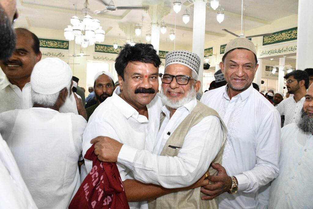 ముస్లీం లు అత్యంత భక్తిశ్రద్ధలతో, గొప్పగా జరుపుకునే పండుగ రంజాన్ అని మాజీమంత్రి, సనత్ నగర్ ఎమ్మెల్యే తలసాని శ్రీనివాస్ యాదవ్ అన్నారు. సోమవారం రంజాన్ పర్వదినం సందర్భంగా రాంగోపాల్ పేట డివిజన్ లోని సుభాష్ రోడ్ లో జామియా మసీదులో నిర్వహించిన ప్రత్యేక ప్రార్ధనలలో ఎమ్మెల్యే తలసాని శ్రీనివాస్ యాదవ్ పాల్గొన్నారు. ప్రార్ధనల అనంతరం ముస్లీం సోదరులను ఆలింగనం చేసుకొని రంజాన్ శుభాకాంక్షలు తెలిపారు.