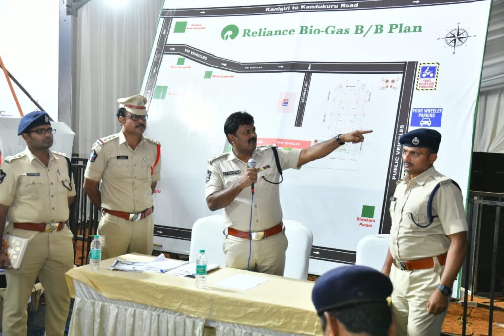 ప్రకాశం జిల్లా, పిసి పల్లి మండలం, దివాకరపల్లె గ్రామం వద్ద ఏర్పాటు చేయనున్న రిలయన్స్ సీబీజీ ప్లాంట్ భూమి పూజ కార్యక్రమానికి ఈ నెల 2న గౌరవ రాష్ట్ర మానవ వనరుల అభివృద్ధి శాఖ మంత్రి నారా లోకేష్ మరియు తదితరులు విచ్చేయుచున్న సందర్భంగా మంగళవారం జిల్లా ఎస్పీ బందోబస్తు విధులలో పాల్గొనబోయే పోలీసు అధికారులు, సిబ్బందితో సభా వేదిక వద్ద సమావేశాన్ని నిర్వహించారు. బందోబస్తు విధులపై దిశానిర్దేశం చేశారు. కార్యక్రమం ప్రారంభం నుండి ముగిసింతవరకు బందోబస్తు విధులు నిర్వర్తించే అధికారులు మరియు సిబ్బంది అప్రమత్తంగా ఉంటూ విధులు నిర్వహించాలని జిల్లా ఎస్పీ ఆదేశించారు.