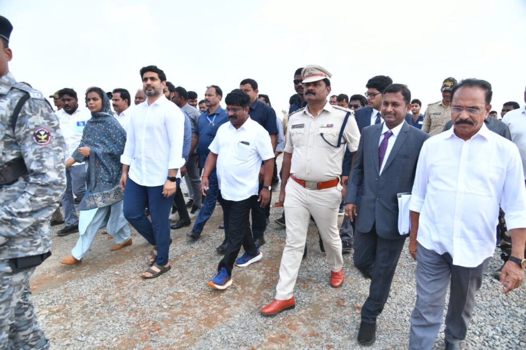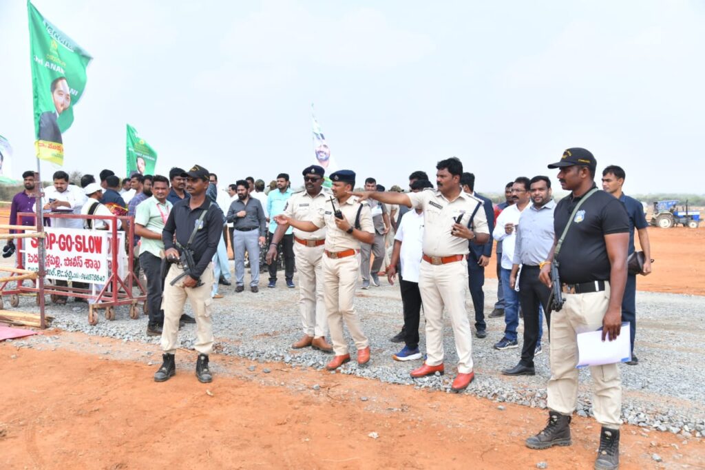 ప్రకాశం జిల్లా, పిసి పల్లి మండలం, దివాకరపల్లె గ్రామం వద్ద ఏర్పాటు చేయనున్న రిలయన్స్ సీబీజీ ప్లాంట్ భూమి పూజ కార్యక్రమానికి గౌరవ రాష్ట్ర విద్య, ఐటి శాఖల మంత్రి నారా లోకేష్ విచ్చేసిన సందర్భంగా హెలిప్యాడ్ ఏరియా వద్ద ప్రకాశం జిల్లా ఎస్పీ ఏ ఆర్ దామోదర్ మర్యాద పూర్వకంగా కలిశారు. తదుపరి భూమి పూజ కార్యక్రమంలో పాల్గొని మరియు సభకు మంత్రి పాల్గొని తిరిగి బయలుదేరారు. ముందుగా హెలిప్యాడ్, వి.ఐ.పి రూట్, బందోబస్తు, సభా వేదిక, డ్రోన్ కెమెరాలతో చుట్టూ ఉన్న ప్రదేశాన్ని, పార్కింగ్ ప్రదేశాలను మరియు భద్రతా ఏర్పాట్లను జిల్లా ఎస్పీ పరిశీలించి అధికారులకు పలు సూచనలు తెలియచేశారు. ఎలాంటి అవాంఛనీయ ఘటనలు జరగకుండా జిల్లా పోలీసు యంత్రాంగం కట్టుదిట్టమైన బందోబస్తు మరియు భద్రతా ఏర్పాట్లు చేసి మంత్రి పర్యటన విజయవంతంగా నిర్వహించడమైనది. బందోబస్తుల పాల్గొన్న పోలీస్ సిబ్బందిని ఎస్పీ అభినందించారు.