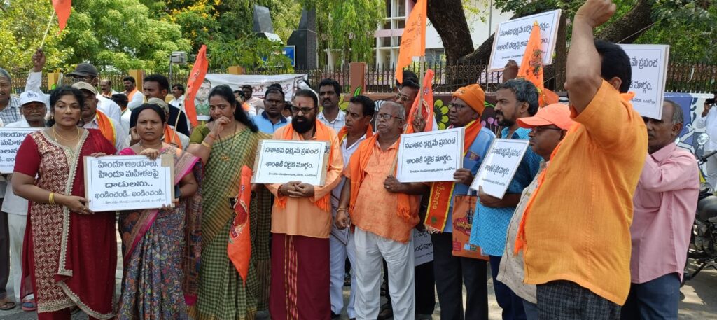 పశ్చిమబెంగాల్లో రాష్ట్ర ముఖ్యమంత్రి మమతా బెనర్జీ సపోర్టుతో అక్కడి ముస్లిమ్స్ మరియు దేశంలో చొరబడిన రోహింగ్యాలు హిందువులపై దాడులు చేస్తు, హిందువులకు చెందిన వేలాది ఎకరాల పంటపొలాలను ధ్వంసం చేస్తూ… హిందులను గ్రామాలనుండి తరిమివేస్తు బెంగాల్ ను మరో కాశ్మీరుగా చేస్తున్న నేపథ్యంలో బెంగాల్ హిందువులను రక్షించని మమతా బెనర్జీ పాలనను రద్దుచేసి వెంటనే రాష్ట్రపతి పాలన విధించాలని, హిందువులను రక్షించాలని, అక్రమ చొరబాటుదార్లు రోహింగ్యాలను దేశంనుండి తరిమికొట్టాలని కోరుతూ… విశ్వహిందూ పరిషత్ ఒంగోలు జిల్లా అధ్యక్షులు తూనుగుంట మల్లికార్జునరావు నేతృత్వంలో ప్రకాశం జిల్లా కలెక్టరేట్ ప్రకాశం భవనం – ధర్నాస్థలి వద్ద విశ్వహిందూ పరిషత్ కార్యకర్తలు ధర్నా నిర్వహించారు. పెద్దపెట్టున నినాదాలు చేశారు. అనంతరం కలెక్టరేట్ ఏవో చింతలపూడి శ్రీనివాసరావుకు వినతి పత్రం సమర్పించారు.