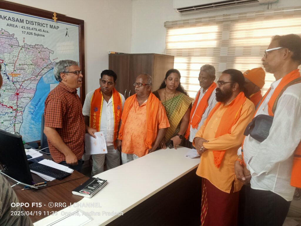 ఈ సందర్భంగా ప్రాంత సత్సంగ ప్రముఖ్ సోమ సుబ్బారావు మాట్లాడుతూ వక్ఫ్ చట్టం సవరణలు పార్లమెంట్ చట్టసభల్లో ఆమోదం పొందిన తరువాత దేశంలోని ముస్లిమ్స్, తమ అధిక జనాభా గల పశ్చిమ బెంగాల్ రాష్ట్రంలో పలు ప్రాంతాల్లో అరాచకాలు సృష్టిస్తూ, హిందువుల ఇళ్లను దోచుకుంటూ, హిందువులను ఇళ్ల నుండి తరిమివేస్తూ… మహిళలను పిల్లలను హింసిస్తూ, పంట పొలాలను సైతం ధ్వంసం చేస్తున్న వారిని శిక్షించాల్సిన రాష్ట్ర ముఖ్యమంత్రి అక్రమ చొరబాటుదారులు మరియు అరాచక ముస్లిం మూకలకు సపోర్టుగా ఉండి పైశాచిక ఆనందాన్ని పొందుతున్న తరుణంలో విశ్వహిందూ పరిషత్ పశ్చిమబెంగాల్లో మమతా బెనర్జీ పాలనను భర్తరఫ్ చేసి రాష్ట్రపతి పాలన విధించాలని కోరుతూ దేశవ్యాప్తంగా విశ్వహిందూ పరిషత్ కార్యకర్తలు ఆయా జిల్లాల్లో కలెక్టర్లకు వినతి పత్రాలు సమర్పించారని తెలిపారు. ఆ నేపధ్యంలో నేడు కలెక్టర్ ద్వారా రాష్త్రపతికి వినతిపత్రం పంపామని తెలిపారు.