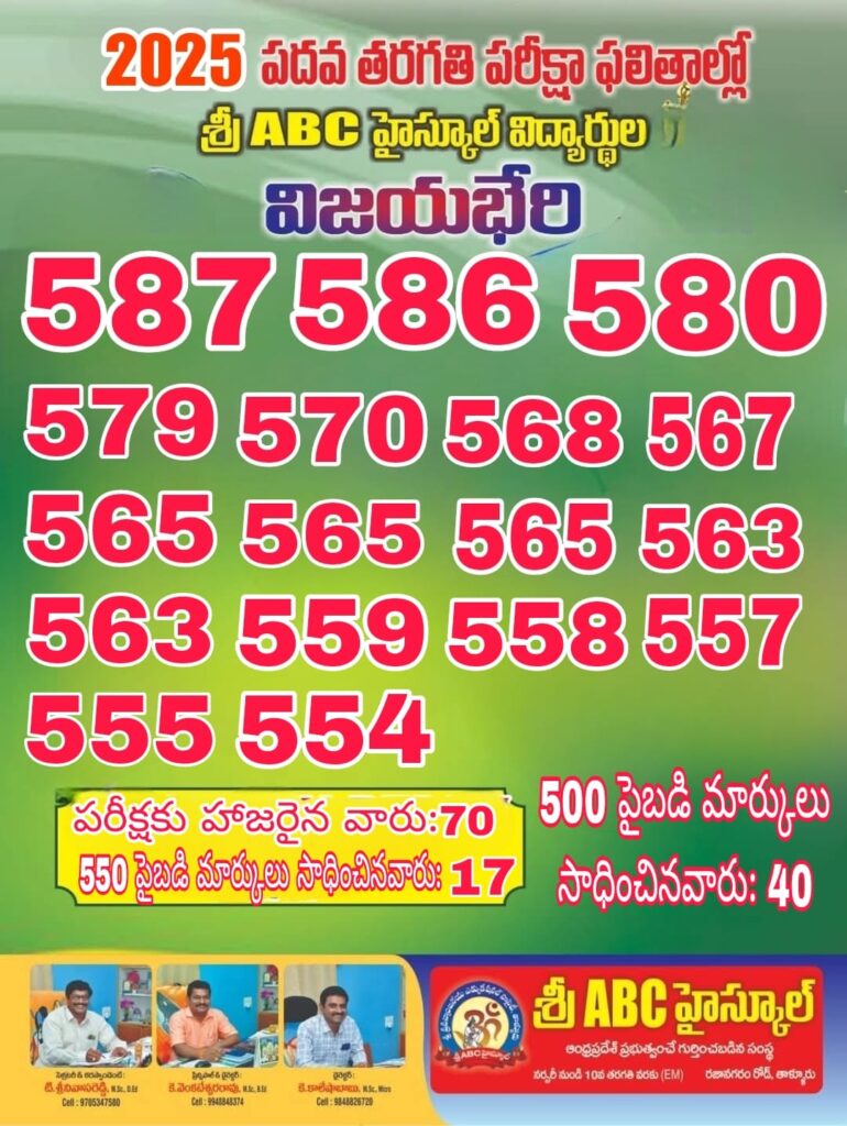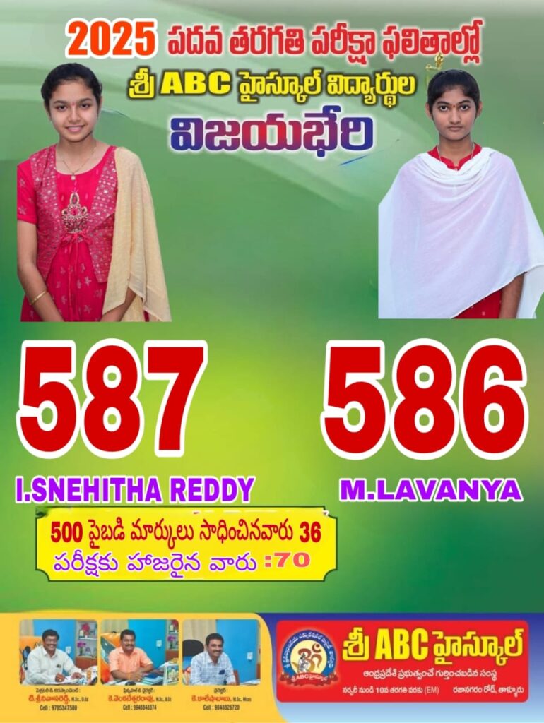 శారద హైస్కూల్ కి చెందిన షేక్ మాలిక్ (584), అమెరికా పబ్లిక్ స్కూల్ విద్యార్థి సిహెచ్ మనోజ్ (581), వాసంతి (571), గంగా హైస్కూల్ విద్యార్థి జి శివ సంజన (580), శివ శంకర్ (576), సాధించారు. జాహ్నవి హైస్కూల్ విద్యార్థి జి నవిత రెడ్డి (561), ప్రగతి హైస్కూల్ విద్యార్థి ఎ త్రివేణి (543) సాధించి ఆయా పాఠశాలలలో మొదటి ర్యాంక్లు సాధించారు. విద్యార్థులను ఎంఈఓ జి సుబ్బయ్య, ఆయా పాఠశాలల కరస్పాండెంట్స్,ప్రధానోపాధ్యాయులు, డైరెక్టర్స్ అభినందించారు.