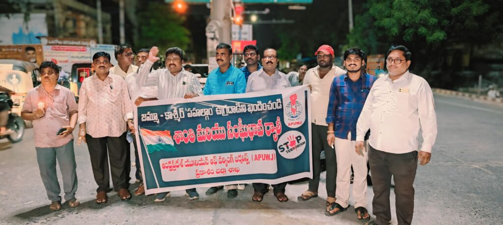 టెర్రరిస్టు దాడిలో చనిపోయిన మృతులకు తీవ్ర సంతాపాన్ని ప్రకటించారు.ఈ కార్యక్రమంలో ఏపీయూడబ్ల్యూజే రాష్ట్ర కార్యవర్గ సభ్యులు అలుగుల సురేష్ ఏపీయూడబ్ల్యూజే జిల్లా కార్యదర్శి దాసరి కనకయ్య ఐ జె యు సభ్యులు కే శ్రీనివాసరావు, ఏపీయూడబ్ల్యూజే ఉపాధ్యక్షులు భాష ,కార్యవర్గ సభ్యులు విజయ్, ఆంధ్రప్రభ బ్యూరో ఇంచార్జ్ భాస్కర్ రెడ్డి, రాజా, విశాలాంధ్ర స్టాప్ రిపోర్టర్ నాగేశ్వరరావు, గంగా న్యూస్ ఎడిటర్ లింగరాజు , పేన్ పవర్ స్టాప్ రిపోర్టర్ హనీఫ్ ఖాన్ తదితరులు పాల్గొన్నారు.