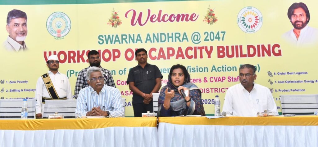 సోమవారం ఒంగోలులోని ఎన్జిఓ హోమ్ లో స్వర్ణాంద్ర 2047 విజన్ డాక్యుమెంట్ లో భాగంగా నియోజక వర్గాల విజన్ డాక్యుమెంట్ రూపకల్పన మరియు ముఖ్య నిర్దేశిత లక్ష్యాలపై ప్రకాశం, శ్రీ పొట్టి శ్రీరాములు నెల్లూరు జిల్లాలకు సంబంధించి ఏర్పాటుచేసిన వర్క్ షాప్ లో జిల్లా కలెక్టర్ కలెక్టర్ ఏ తమీమ్ అన్సారియా పాల్గొని మాట్లాడుతూ స్వర్ణాంద్ర 2047 విజన్ డాక్యుమెంట్ లో భాగంగా జిల్లా విజన్ ప్లాన్ ను రూపొందించడం జరిగిందన్నారు. ప్రస్తుతం నియోజక వర్గాల వారీగా విజన్ డాక్యుమెంట్ ను తయారు చేయుటకు అవసరమైన శిక్షణ ఇచ్చుటకు ఈ రోజు వర్క్ షాప్ ను నిర్వహించడం జరుగుచున్నదన్నారు. ఒక నియోజకవర్గం లో రానున్న సంవత్సరాల కాలంలో ఏ సెక్టార్ లో అభివృద్ధి, వృద్ది రేటు ఎలా ఉంటుంది, వాటిని ఎలా అభివృద్ధి చేయాలన్న అంశాలపై నియోజక వర్గాల వారీగా యాక్షన్ ప్లాన్ ను రూపొందించాల్సిన అవసరం ఉందన్నారు. అందులో భాగంగా నియోజక వర్గాల యాక్షన్ ప్లాన్ రూపకల్పనకు అవసరమైన శిక్షణా కార్యక్రమాలను అమలు చేస్తున్నట్లు తెలిపారు. స్వర్ణాంద్ర 2047 విజన్ డాక్యుమెంట్ లో భాగంగా రాష్ట్ర ముఖ్యమంత్రి శ్రీ నారా చంద్రబాబు నాయుడు గారు ఇచ్చిన పది సూత్రాలను ప్రతి ఒక్కరు క్షుణ్ణంగా తెలుసుకుని అవగాహన కలిగి ఉండాలన్నారు. ఈ వర్క్ షాప్ లో ప్రభుత్వం నిర్దేశించిన పది సూత్రాలతో పాటు ప్రైమరీ, సెకండరీ, సర్వీస్ తదితర వివిధ సెక్టార్ల పై అవగాహన కల్పించడం జరుగుతుందన్నారు. నియోజక వర్గ స్థాయి పరిస్థితులను, వనరులను పూర్తిగా అధ్యయనం చేసి, వాటికి తగ్గట్టుగా సృజనాత్మకంగా ఆలోచించి, ప్రజల జీవన ప్రమాణాలను పెంపొందేలా నియోజక వర్గ స్థాయి ప్రణాళికలను రూపొందించడంలో ప్రత్యేక దృష్టి సారించాలని సూచించారు.