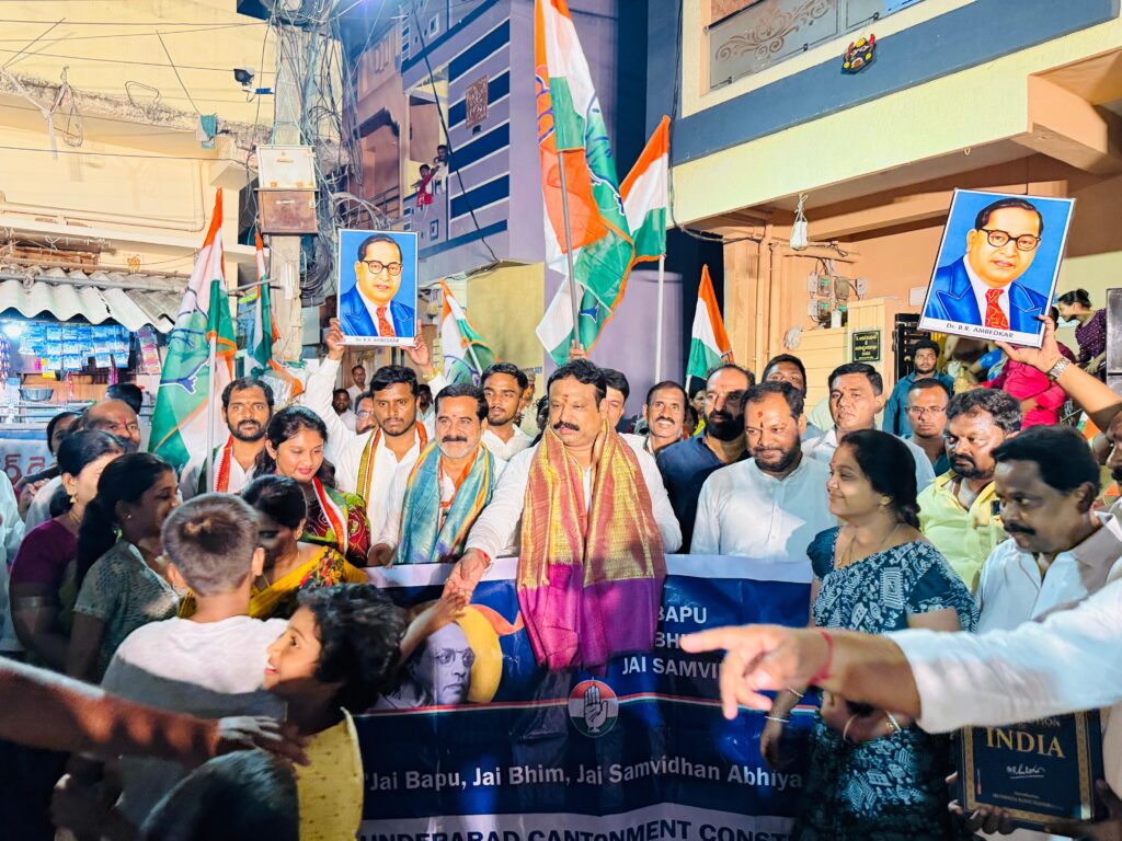 భారతీయ జనతా పార్టీ దేశంలో ప్రజాస్వామ్యాన్ని రాజ్యాంగాన్ని ఖూనీ చేస్తుందని కంటోన్మెంట్ ఎమ్మెల్యే శ్రీ గణేష్ ఆరోపించారు. గురువారం కంటోన్మెంట్ పరిధిలోని 5వ వార్డు లోభారతీయ జనతా పార్టీ అనుసరిస్తున్న రాజ్యాంగ వ్యతిరేక, దళిత వ్యతిరేక విధానాలకు నిరసనగా కాంగ్రెస్ పార్టీ చేపట్టిన జై బాపు- జై భీం- జై సంవిధాన్ అభియాన్ పాదయాత్ర 5వ వార్డు ఇంచార్జ్ పెద్దల నరసింహ ఆధ్వర్యంలో మహాత్మాగాంధీ నగర్ నుంచి దుర్గయ్య గార్డెన్, హనుమంతరావు గార్డెన్, గణేష్ నగర్, ఓల్డ్ సంజీవయ్య నగర్, సెకండ్ లక్ష్మీ నగర్ మీదుగా సంజీవయ్య నగర్, వీకర్ సెక్షన్ పార్క్ అంబేద్కర్ విగ్రహం వరకూ ర్యాలి సాగింది. ఈ కార్యక్రమంలో ఎమ్మెల్యే శ్రీగణేష్, కార్యక్రమ కోఆర్డినేటర్ రాష్ట్ర ఆర్య వైశ్య కార్పొరేషన్ చైర్ పర్సన్ కల్వ సుజాత తో పాటు వార్డు 5 కాంగ్రెస్ నాయకులు పెద్ద ఎత్తున పాల్గొన్నారు.