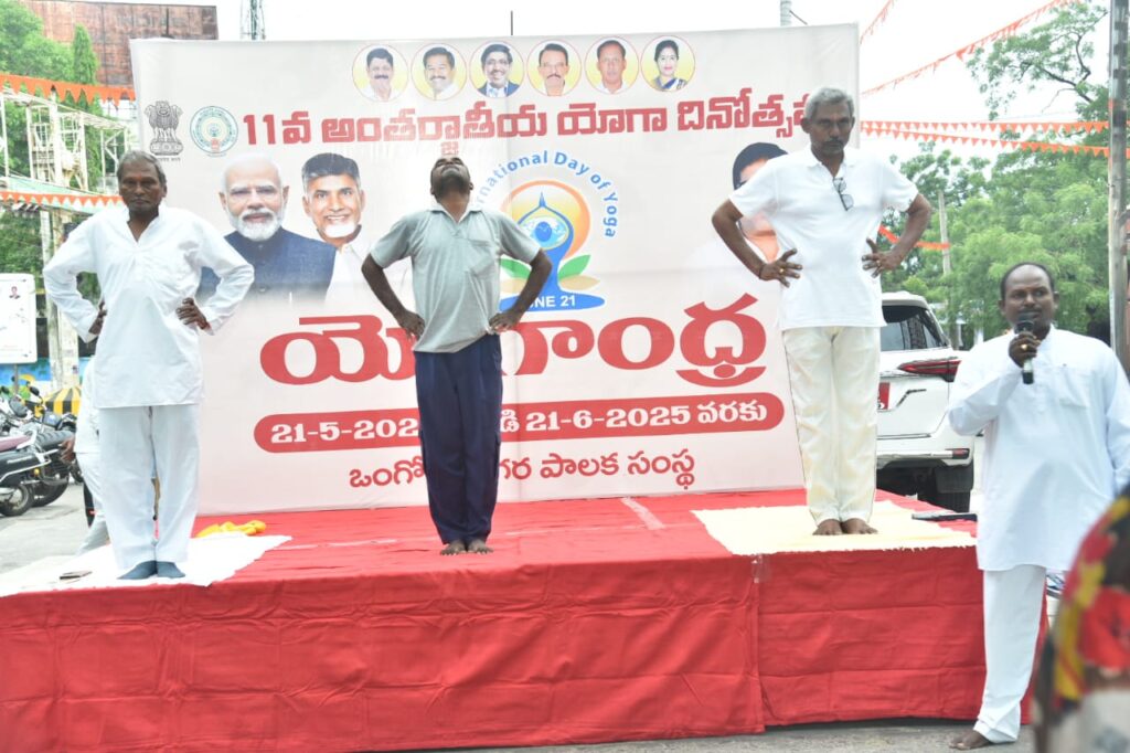 యోగాంధ్ర-2025 మాసోత్సవాల్లో భాగంగా శనివారం ఉదయం ప్రకాశం భవనం ఎదురుగా ఏర్పాటుచేసిన యోగ రోడ్డు లో జిల్లా కలెక్టర్ తమీమ్ అన్సారియా, నగర మేయర్ గంగాడ సుజాత, జాయింట్ కలెక్టర్ ఆర్ గోపాల కృష్ణ, జిల్లా రెవెన్యూ అధికారి చిన ఓబులేసు, ఆర్డిఓ లక్ష్మి ప్రసన్న, నగర కమీషనర్ వెంకటేశ్వర రావు, జిల్లా వైద్య ఆరోగ్య శాఖాధికారి డా. వెంకటేశ్వర రావు లతో కలసి యోగాసనాలు చేశారు.