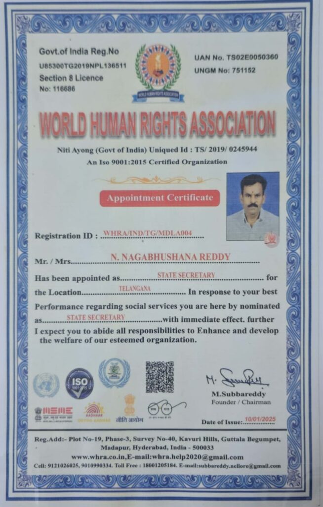 తెలంగాణ రాష్ట్ర మానవ హక్కుల సంఘం కార్యదర్శ గా శ్రీ రామ క్యాటరింగ్ అధినేత,బిజెపి నాయకుడు ఎన్.నాగభూషణం రెడ్డి ని జాతీయ మానవ హక్కుల చైర్మన్ యం. శుభారెడ్డి,తెలంగాణ రాష్ట్ర చైర్మన్ చల్లా గీతా రెడ్డి ఎంపిక చేస్తూ నియామక పత్రాన్ని అందజేశారు.
