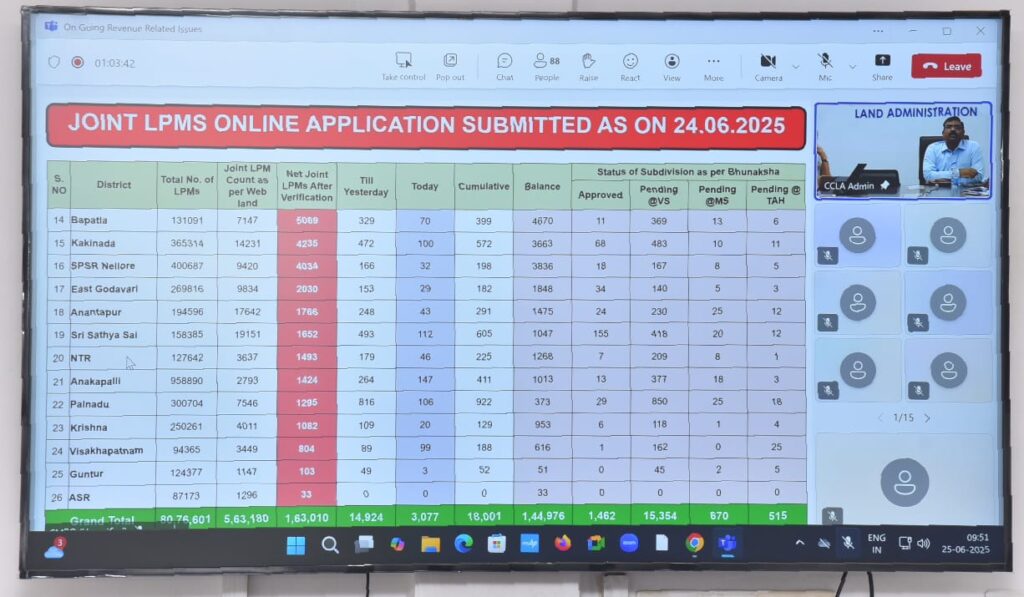 ఈ వీడియో కాన్ఫెరెన్స్ కు ఒంగోలు కలెక్టరేట్ నుండి జిల్లా కలెక్టర్ ఏ తమీమ్ అన్సారియా, జాయింట్ కలెక్టర్ ఆర్ గోపాల క్రిష్ణ, జిల్లా రెవెన్యూ అధికారి చిన ఓబులేసు, స్పెషల్ డిప్యూటీ కలెక్టర్ వర కుమార్, జిల్లా సర్వే ల్యాండ్ రికార్డ్స్ అధికారి గౌస్ భాషా, ల్యాండ్ సెక్షన్ సిబ్బంది తదితరులు తదితరులు పాల్గొన్నారు.