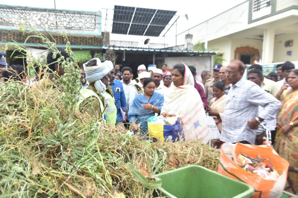 అనంతరం జిల్లా కలెక్టర్ కెల్లంపల్లి గ్రామాన్ని సందర్శించి గ్రామంలో జరుగుచున్న పారిశుధ్య నిర్వహణను పరిశీలించారు. గ్రామంలో గుర్తించబడిన బంగారు కుటుంబాల సభ్యులతో జిల్లా కలెక్టర్ మాట్లాడి భరోసా కల్పించారు. ఈ గ్రామంలో పి4 కార్యక్రమం కింద 10 కుటుంబాలను దత్తతు తీసుకున్న నిడమానూరు శ్రీనివాస రావు ను జిల్లా కలెక్టర్ ప్రత్యేకంగా అభినందిస్తూ శాలువాతో సన్మానించారు. అనంతరం గ్రామంలోని చెత్త నుండి సంపద తయారీ కేంద్రాన్ని సందర్శించి వర్మీ కంపోష్ట్ తొట్టెలను, పనితీరును పరిశీలించారు. ఈ సందర్భంగా గ్రామంలో ప్రతి రోజు డోర్ టు డోర్ చెత్త సేకరణ కార్యక్రమం ఏ విధంగా జరుగుచున్నది, ఎంతమంది సిబ్బంది వున్నారు, సేకరించిన చెత్తను ఏ విధంగా తడి చెత్త, పొడి చెత్తగా వేరుచేస్తున్నారు, తదితర వివరాలను పంచాయతీ శాఖ అధికారులు, జిల్లా కలెక్టర్ కు వివరించారు. ఈ సందర్భంగా క్లాప్ మిత్రలతో జిల్లా కలెక్టర్ మాట్లాడుతూ…. నెలకు ఎంత జీతం ఇస్తున్నారు, హెల్త్ కార్డ్స్, ఇన్సూరెన్స్ ఉందా లేదా అని వివరాలు అడిగి తెలుసుకున్నారు. గ్రామంలో చెత్త సేకరణ, పారిశుధ్య నిర్వహణ పటిష్టంగా అమలు జరిగేలా చర్యలు చేపట్టాలని జిల్లా కలెక్టర్, పంచాయతీ అధికారులను ఆదేశించారు. అనంతరం జిల్లా కలెక్టర్ పెద్ద ఉల్లగల్లు గ్రామాన్ని సందర్శించి గ్రామంలోని చెత్త నుండి సంపద తయారీ కేంద్రాన్ని, వర్మీ కంపోష్ట్ తొట్టెలను, పనితీరును పరిశీలించారు.