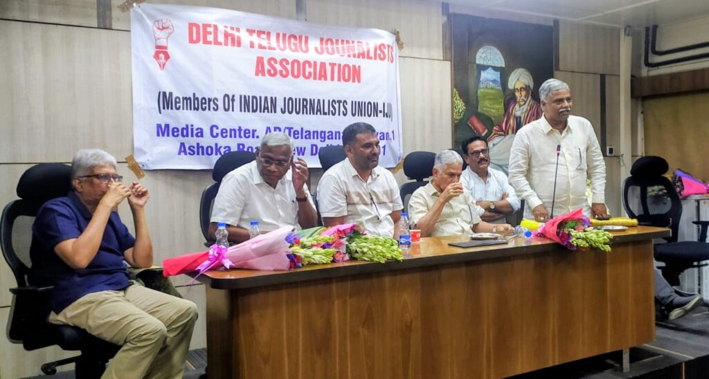 న్యూఢిల్లీ కేంద్రంగా పనిచేస్తున్న తెలుగు ప్రింట్, ఎలెక్ట్రానిక్ మీడియా ప్రతినిధుల ఐజేయూ సభ్యుల సమావేశం మంగళవారం న్యూఢిల్లీ ఏపీ, తెలంగాణా భవన్ సముదాయం లోని గురజాడ సమావేశ మందిరంలో టీవీ 5 ప్రతినిధి టి. శ్రీనివాసరావు అధ్యక్షతన జరిగింది. తాము ఎదుర్కుంటున్న సమస్యలను వివరిస్తూ, వాటిని పరిష్కారం చేయాలని రెండు తెలుగు రాష్ట్రాల మీడియా అకాడమీల చైర్మన్ లను ఆయన కోరారు. టీ.యు.డబ్ల్యు.జే. అధ్యక్షుడు కే.విరాహత్ అలీ, ఏపీ యూడబ్ల్యూజే అధ్యక్షుడు ఐ.వి.సుబ్బారావు సమావేశంలో మాట్లాడుతూ డిల్లీ లోని తెలుగు జర్నలిస్టుల సమస్యలను రాష్ట్ర ప్రభుత్వాల దృష్టికి తీసుకు వెళ్తామని, డిల్లీ జర్నలిస్టులకు అండగా ఉంటామనివారిద్దరూ హామీ ఇచ్చారు. ఐజేయు స్టీరింగ్ కమిటీ సభ్యులు దేవులపల్లి అమర్ మాట్లాడుతూ గతంలో డిల్లీ తెలుగు జర్నలిస్టుల సంక్షేమానికి జరిగిన కృషిని, ఐజేయూ సాగించిన ప్రయత్నాలను వివరించారు.