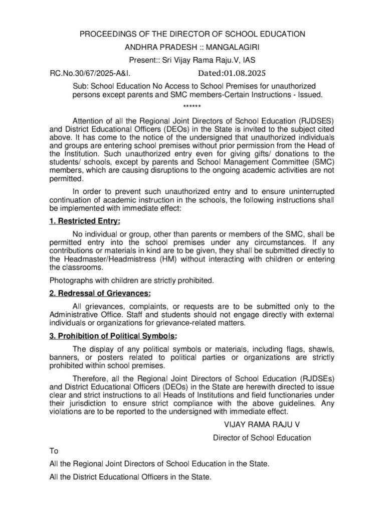 పాఠశాలలోకి పాలిటిక్స్ నో ఎంట్రీ By JSDM NEWS Updated: Fri, 01 Aug, 2025 9:47 PM ఆంధ్రప్రదేశ్, జాతీయ వార్తలు, తెలంగాణ Follow on 01 Aug పాఠశాల ఆవరణలోకి తల్లిదండ్రులు, స్కూల్ మేనేజ్మెంట్ కమిటీ సభ్యులు తప్ప ఏ ఇతర అనధికారిక వ్యక్తులను అనుమతించరాదు. WhatsApp Join Now Telegram Join Now Youtube Subscribe రాజకీయ పార్టీల గుర్తులు, వస్తువుల ప్రదర్శన నిషేధం చేస్తూ ఉత్తర్వులు విడుదల చేసిన ఏపీ ప్రభుత్వం.