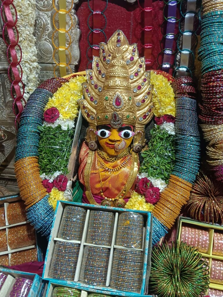 సికింద్రాబాద్ శ్రీ ఉజ్జయిని మహాకాళి అమ్మవారు శుక్రవారం గాజుల అలంకారం లో భక్తులకు దర్శనం ఇచ్చారు.మూడవ శుక్రవారం సందర్భంగా శ్రీ ఉజ్జయిని మహాకాళి అమ్మవారు ,మాణిక్యాల అమ్మవార్లు గాజుల అలంకరణలో దర్శనం ఇవ్వడంతో అమ్మవార్లను దర్శించుకునేందుకు ఉదయం నుంచి భక్తులు పెద్ద సంఖ్యలో ఆలయానికి తరలి వచ్చారు.