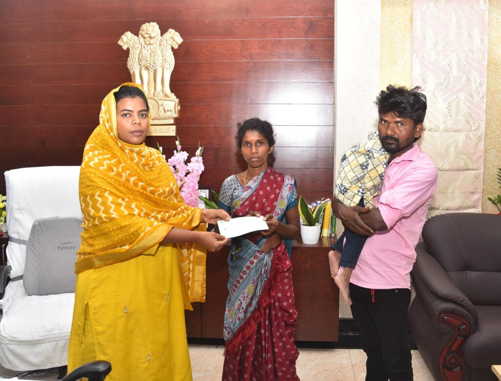 రాష్ట్ర ముఖ్యమంత్రి నారా చంద్ర బాబు నాయుడు ఇటీవల దర్శి మండలం, తూర్పువీరాయపాలెం గ్రామంలో పర్యటించిన సందర్భంగా ముఖ్యమంత్రి ఇచ్చిన హామీ మేరకు సోమవారం సాయంత్రం ఒంగోలు జిల్లా కలెక్టర్ వారి క్యాంపు కార్యాలయంలో జిల్లా కలెక్టర్ ఏ తమీమ్ అన్సారియా, గల్లెపోగు యలమంద, ప్రశాంతి దంపతులకు ఒక లక్షా 50 వేల రూపాయల చెక్కు ను అందచేసారు. అన్నదాత సుఖీభవ కార్యక్రమం ప్రారంభోత్సం సందర్భంగా ఈ నెల 2వ తేదీన రాష్ర ముఖ్యమంత్రి నారా చంద్రబాబు నాయుడు గారు దర్శి మండలం, తూర్పువీరాయపాలెం గ్రామంలో పర్యటించిన నేపధ్యంలో దర్శి పట్టణానికి చెందిన గల్లెపోగు యలమంద, ప్రశాంతి దంపతులు పోలియో కలిగిన 5 సంవత్సరాల తన కుమారుడుతో కలసి ముఖ్యమంత్రి గారిని కలసి తన కుటుంబాన్ని ఆదుకోవాలని అలాగే తన కుమారునికి సదరం సర్టిఫికేట్ ఇప్పించాలని అర్జీ ఇవ్వడం జరిగింది. అందులో భాగంగా ముఖ్యమంత్రి ఆదేశాల మేరకు ఈ రోజు జిల్లా కలెక్టర్ తమీమ్ అన్సారియా, గల్లెపోగు యలమంద, ప్రశాంతి దంపతులకు ఒక లక్షా 50 వేల రూపాయల చెక్కు ను అందచేసారు. అలాగే త్వరలో సదరం సర్టిఫికేట్ ఇవ్వడం జరుగుతుందని జిల్లా కలెక్టర్, ఆ దంపతులకు తెలపడం జరిగింది.