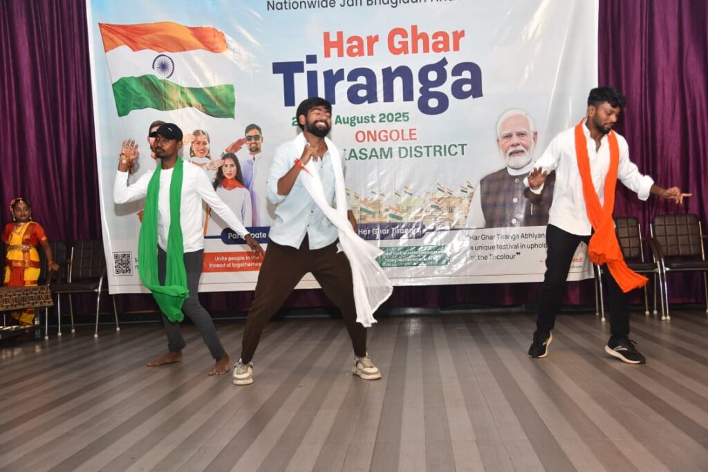 ఒంగోలులోని ఎన్టిఆర్ కళా పరిషత్ భవనంలో మెప్మా ఆధ్వర్యంలో నిర్వహించిన హర్ ఘర్ తిరంగా కార్యక్రమానికి జాయింట్ కలెక్టర్ ఆర్ గోపాల క్రిష్ణ ముఖ్యఅతిధిగా పాల్గొని మాట్లాడుతూ.. కేంద్ర రాష్ట్ర ప్రభుత్వాల ఆదేశాల్ మేరకు జిల్లా వ్యాప్తంగా హర్ ఘర్ తిరంగా కార్యక్రమాలు ఘనంగా నిర్వహించుకోవడం జరుగుచున్నదన్నారు. ప్రతి ఒక్కరిలో ముఖ్యంగా యువతలో దేశ భక్తిని పెంపొందించడంలో భాగంగా ప్రతి ఇంటిపై జాతీయ జెండా ఎగురవేయాలన్నదే హర్ ఘర్ తిరంగా కార్యక్రమం ముఖ్య ఉద్దేశ్యమన్నారు. ఎందరో మహనీయుల త్యాగఫలితమే మనకు స్వాతంత్ర్యం రావడం జరిగిందని, వారిని పేరు పేరునా వారి త్యాగాలను మనం స్మరించుకోవాల్సిన అవసరం ఉందన్నారు. మనం మనకోసం బతుకుతూ దేశం కోసం మనం ఏమి చేస్తున్నాం అని ప్రతి ఒక్కరూ ఆలోచించాల్సిన అవసరం ఉందన్నారు. ప్రతి ఒక్కరూ హర్ ఘర్ తిరంగా కార్యక్రమాల్లో భాగస్వాములై దేశ భక్తిని, ఔనత్యాన్ని చాటుతూ కార్యక్రమాలను విజయవంతం చేయాలన్నారు.