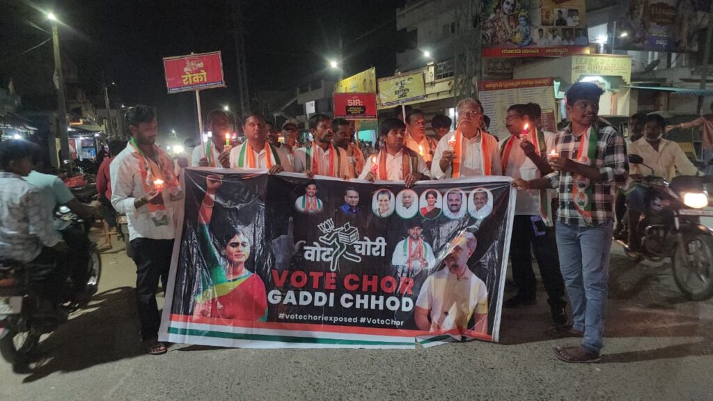 ఓటు హక్కు హరణకు చేస్తున్న కుట్రలకు నిరసనగా తాళ్లూరులో కాంగ్రెస్ పార్టీ ఆధ్వర్యంలో కొవ్వోత్తుల ర్యాలీ నిర్వహించారు. ఆపార్టీ దర్శి నియోజక వర్గ సమన్వయ కర్త, రాష్ట్ర కె కెనీ చైర్మన్ కైపు వెంకట క్రిష్ణా రెడ్డి, మండల అధ్యక్షుడు కూకట్ల వీర బ్రహ్మం ల ఆధ్వర్యంలో ర్యాలీ నిర్వహించి ప్రజల ఓటు హక్కును హరించేందుకు బిజేపి చేస్తున్న కుయుక్తలను వివరించారు. ఓటు చోరీ పోరాటాన్ని జయప్రదం చెయ్యాలని కోరారు.