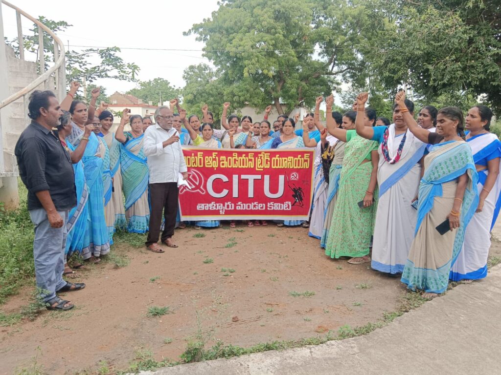 ప్రభుత్వం తక్షణమే కార్మికుల అపరిష్కృత సమస్యలు పరిష్కరించాలని కోరుతూ గురువారం సీఐటీయూ ఆధ్వర్యంలో స్కీం వర్కర్స్ ర్యాలీ నిర్వహించారు. సీఐటీయూ జిల్లా కార్యదర్శి బోడపాటి హనుమంత రావు మాట్లాడుతూ మోదీ ప్రభుత్వం బ్రిటీష్ కాలం నుండి పోరాడి తెచ్చుకున్న హక్కులను కాలరాస్తున్నారని అన్నారు. అంగన్వాడీ వేతనాలు పెంచాలని, ఎఫ్ ఆర్ ఎన్ రద్దు చెయ్యాలని, సంక్షేమ పధకాలు అమలు చెయ్యాలని, గ్యాడ్యూటీ రూ.1.50 లక్షలు ఇవ్వాలని, కూటమి ప్రభుత్వం ఇచ్చిన హామీలు అమలు చెయ్యాలని నినదించారు.