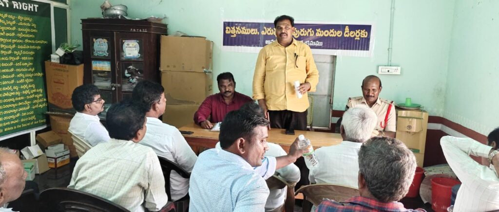 ప్రతి సామాన్య రైతుకు యూరియా అందే విధంగా అర్హలైన రైతులకు ఎరువులు ఇవ్వాలని తహసీల్దార్ బివి రమణా రావు కోరారు. స్థానిక వ్యవసాయశాఖ కార్యాలయంలో సోమవారం విత్తనాలు ఎరువులు, పురుగు మందుల డీలర్లకు అవగాహన సమావేశం వ్యవసాయాధికారి ప్రసాదరావు అధ్యక్షతన నిర్వహించారు. ముఖ్య అతిధిగా తహసీల్దార్ బివి రమణా రావు, ఎఎస్సై మోహన రావులు పాల్గొన్నారు. తహసీల్దార్ మాట్లాడుతూ యూరియా కృత్రిమ కొరత సృష్టిస్తే కఠిన చర్యలు తప్పవని అన్నారు. రైతులు అవసరమైన మేర మాత్రమే నిజమైన రైతులకు ఎరువులు అందించాలని చెప్పారు. వ్యవసాయాధికారి ప్రసాద రావు మాట్లాడుతూ ప్రస్తుతం ప్రవేట్ డీలర్ల వద్ద 755.1 మెట్రిక్ టన్నుల ఎరువులు ఉన్నాయని, ఆర్ బి కే ల ద్వారా ఇప్పటికే 92 టన్నులు సరఫరా చేసామని తెలిపారు. ఇది నిరంతర ప్రక్రియ అని అన్నారు. కొందరు రైతులు ఒక డీలర్కి తెలియకుండా మరోక డీలర్ వద్ద అధిక మొత్తంలో యూరియా తీసుకుంటున్నారని వారి పట్ల అప్రమత్తంగా ఉండాలని చెప్పారు. కార్యక్రమంలో డీలర్ల అసోషియేషన్ అధ్యక్షుడు జాష్టి వెంకట రావు, డీలర్లు పాలెం శ్రీనివాస రెడ్డి, యండ్ర పల్లి భాస్కర్ రెడ్డి, మారం సుబ్బా రావు , కె గురున్నాథం, మేడగం వెంకటేశ్వర రెడ్డి, నాగి రెడ్డి, హనుమా రెడ్డి తదితరులు పాల్గొన్నారు.
