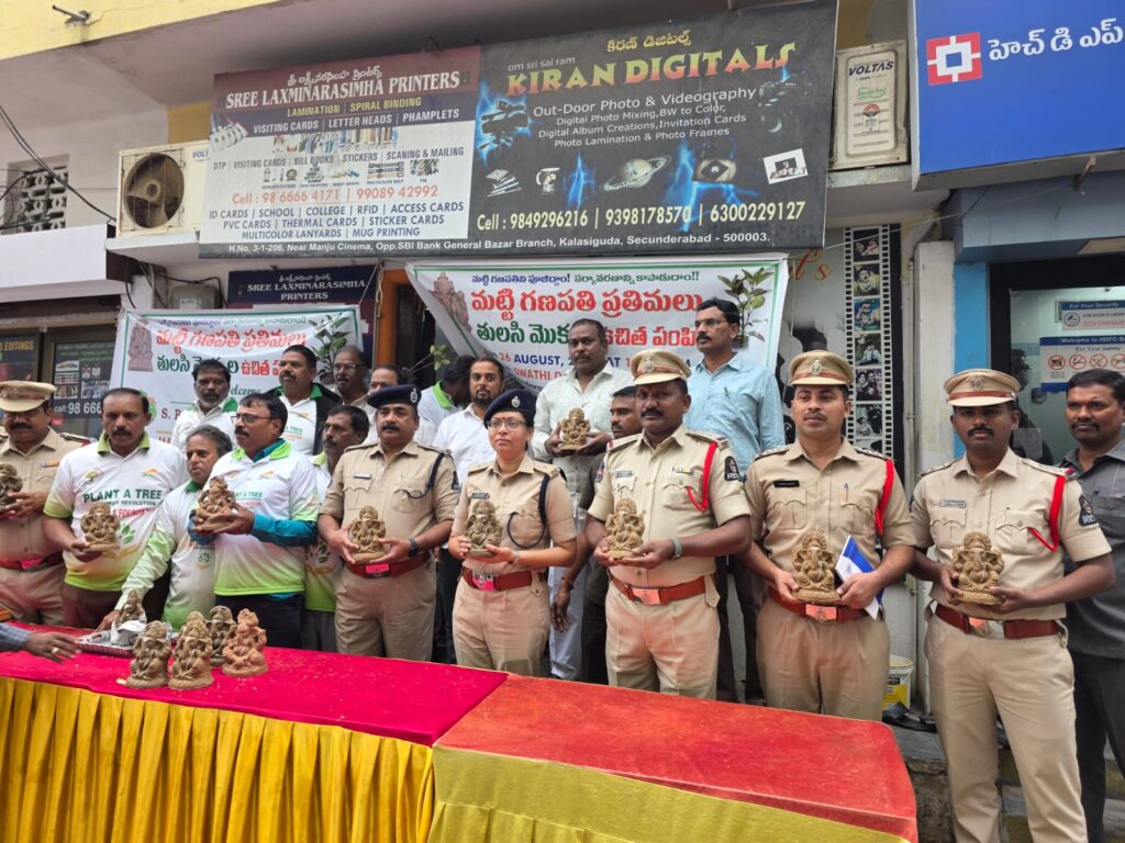 మట్టి గణపతుల ఏర్పాటు ఎన్విరాన్మెంట్ ఫ్రెండ్లీగా ఉంటుందని ఉత్తర మండల డిసిపి సాధన రష్మీ పెరుమాళ్ అన్నారు. మంగళవారం సికింద్రాబాద్ సోమ సుందరం వీధిలో మక్తాల ఫౌండేషన్ ఆధ్వర్యంలో ఏర్పాటు చేసిన మట్టి వినాయకులు, తులసి మొక్కల పంపిణీ కార్యక్రమంలో ముఖ్యఅతిథిగా హాజరైన డిసిపి సాధన రష్మీ పెరుమాళ్ మాట్లాడుతూ తులసి మొక్కలను, మట్టి వినాయకులను పంపిణీ చేస్తూ మక్తాల ఫౌండేషన్ వ్యవస్థాపక అధ్యక్షులు మక్తాల జలంధర్ గౌడ్, సభ్యులు మంచి సందేశాన్ని అందిస్తున్నారని వారిని అభినందించారు. బహిరంగ ప్రదేశాలలో వినాయక మండపాలను ఏర్పాటు చేసే నిర్వాహకులు తగిన భద్రతను ఏర్పాటు చేసుకోవాలని సూచించారు. అనంతరం ఫౌండేషన్ వ్యవస్థాపకుడు జలంధర్ గౌడ్ మాట్లాడుతూ…. ప్రస్తుతమున్న బిజీ లైఫ్ లో పర్యావరణం గురించి ఆలోచించే తీరిక ప్రజల్లో లేకుండా పోతుందని అందువల్లపర్యావరణాన్ని కాపాడడానికి మట్టి గణపతుల పూజ ఓ మార్గమని అన్నారు.