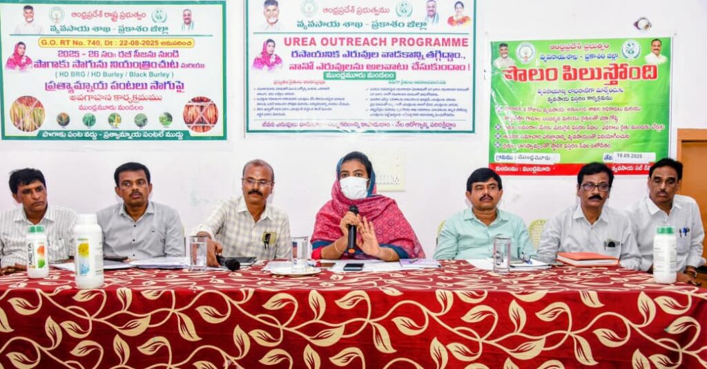 అన్నారు. బుధవారం ముండ్లమూరు మండల కేంద్రంలోని ఎంపిడిఓ కార్యాలయంలో యూరియా సరఫరా, పంపిణీ పై రైతులకు అవగాహన కలిగించే ఉద్దేశంతో చేపట్టిన మెగా అవుట్ రీచ్ కార్యక్రమంలో జిల్లా కలెక్టర్ తమీమ్ అన్సారియా పాల్గొని మాట్లాడుతూ…. స్వర్ణాంధ్ర 2047 విజన్ ప్లాన్ లో భాగంగా రాష్ట్ర ప్రభుత్వం వ్యవసాయ మరియు దాని అనుబంధ రంగాల్లో ప్రతి సంవత్సరం 15 శాతం వృద్ది రేటు సాధించాలన్న లక్ష్యంతో ముందుకు పోతున్న తరుణంలో రైతులకు మంచి జరగేలా, పెట్టుబడి తగ్గించి, దిగుబడి పెంచేలా రైతులకు మంచి ఆదాయం రావాలన్న ఉద్దేశ్యంతో రాష్ట్రంలో అన్నీ ఆర్.ఎస్.కె ద్వారా రైతులకు అవసరమైన సూచనలు, సలహాలు ఇవ్వడం జరుగుచున్నదన్నారు. జిల్లాలో యూరియా కొరత ఉందని అపోహతో రైతులు ఆందోళన చెందుతున్న నేపథ్యంలో గ్రామాల్లో ఇంటింటికి తిరిగి రైతులను చైతన్యపరిచే ఔట్రీచ్ కార్యక్రమాన్ని చేపట్టాలని రాష్ట్ర ముఖ్యమంత్రి చంద్రబాబు నాయుడు జిల్లా కలెక్టర్లను ఆదేశించడం జరిగిందన్నారు. 9వ తేదీన జిల్లా వ్యాప్తంగా గ్రామ స్థాయిలో ఔట్రీచ్ కార్యక్రమాన్ని నిర్వహించి రైతులకు అవగాహన కల్పించే కార్యక్రమాలను చేపట్టడం జరిగిందన్నారు. ఈ రోజు 10 తేదీన మండల స్థాయిలో ఔట్రీచ్ కార్యక్రమాన్ని నిర్వహించి రైతులతో సమావేశాలు నిర్వహించి అవగాహన కార్యక్రమాలను చేపడుతున్నట్లు కలెక్టర్ వివరించారు. క్షేత్ర స్థాయిలో ప్రతి రైతుకు సాగు అనుభవాలు ఉన్నప్పటికినీ, మారుతున్న కాలానుగుణంగా 25 శాతం మేర ఎరువులు, పురుగు మందుల వాడకాన్ని తగ్గించి నానో యూరియా, జీవ ఎరువుల వాడకాన్ని ప్రోత్సహించాలన్న లక్ష్యంతో ఈ ఔట్రీచ్ కార్యక్రమాన్ని నిర్వహించి రైతులకు అవగాహన కల్పించే కార్యక్రమాలను చేపడుతున్నట్లు కలెక్టర్ తెలిపారు. భూ సార పరీక్షల ఆధారంగా వ్యవసాయ శాఖ అధికారులు, శాస్త్రవేత్తల సూచనలు మెలుకవలు పాటిస్తూ ఎంత అవసరమో అంత ఎరువులు, పురుగు మందులు వినియోగిస్తూ సాగు చేసినట్లయితే పెట్టుబడులు తగ్గి, దిగుబడులు పెరిగి రైతుకు మంచి ఆదాయం కలుగుతుందని కలెక్టర్ వివరించారు. వ్యవసాయ రంగంలో డ్రోన్లు అందుబాటులోకి తీసుకురావడం జరిగిందని, రాబోయే రోజుల్లో మరిన్ని డ్రోన్ల సాంకేతికతను రైతులకు అందుబాటులోకి తెచ్చి వినియోగం పెంచనున్నామని అన్నారు. డ్రోన్ వినియోగం, నానో యూరియా, డి ఏ పి పిచికారి విధానాన్ని, రైతులకు ఎంతమేర ప్రయోజనంగా ఉంటుంది అన్న విషయాలను క్షేత్ర్త స్థాయిలో వ్యవసాయ శాఖ అధికారులు రైతులకు అవగాహన కల్పించడం జరుగుచున్నదన్నారు. వ్యవసాయం సులభతరం, తక్కువ పెట్టుబడితో అధిక దిగుబడులు సాధించే దిశగా రైతులు అడుగులు వేయాలని జిల్లా కలెక్టర్ కోరారు. రైతులు సాంకేతికను అందిపుచ్చుకొని వ్యవసాయం లాభసాటిగా మారాలని సూచించారు. రైతులు ఆధునిక వ