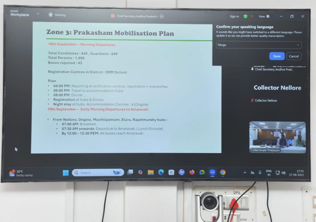 ఉమ్మడి ప్రకాశం జిల్లా నుంచి ఎంపికైన 661 మంది అభ్యర్థులను, జోనల్ స్థాయిలో ఎంపికైన ప్రిన్సిపాల్స్, పీజీటీలు, టీజీటీలు 188 మందిని విజయవాడ తరలించేందుకు తీసుకుంటున్న చర్యలను కలెక్టర్ ఈ సందర్భంగా సి.ఎస్. కు వివరించారు. ఒంగోలు నగరంలోని సెయింట్ జేవియర్ హై స్కూల్, ఆగ్జిలియం హై స్కూల్, మంగమూరు డొంకలో ఉన్న రామచంద్ర మిషన్, వెంగముక్కలపాలెంలో ఉన్న క్విస్ ఇంజనీరింగ్ కాలేజీలకు అభ్యర్థులను ఈనెల 18వ తేదీ సాయంత్రం 4 గంటలలోగా తరలించి 19వ తేదీ ఉదయం 9 గంటల వరకు వసతి కల్పించేలా చర్యలు తీసుకుంటున్నట్లు చెప్పారు. వీరికి అవసరమైన భోజనము, అల్పాహారం సమకూర్చి 19వ తేదీ ఉదయం 9 గంటలకు ప్రత్యేకంగా ఏర్పాటు చేసిన 38 బస్సులలో విజయవాడ తరలిస్తామన్నారు. అభ్యర్థులకు వసతి కల్పిస్తున్న సమయంలో తాగునీరు, ఆహారము, పారిశుద్ధ్యము, విద్యుత్ సరఫరా విషయంలో ఎలాంటి అసౌకర్యం కలుగకుండా ఏర్పాట్లు చేస్తున్నట్లు కలెక్టర్ చెప్పారు. ఈ శిబిరాలలో ప్రత్యేక మెడికల్ క్యాంపులను కూడా ఏర్పాటు చేసేలా వైద్య అధికారులను ఆదేశించానని, భద్రత పరంగా అవసరమైన బందోబస్తు కూడా కల్పిస్తామని చెప్పారు. అభ్యర్థితో పాటు విజయవాడ వచ్చే ఒక సహాయకునికి కూడా ఈ కేంద్రాల్లో ఆశ్రయం కల్పిస్తున్నట్లు తెలిపారు. ప్రతి బస్సులోనూ విద్యాశాఖ సిబ్బందితోపాటు ఒక పోలీసు కూడా ఉండేలా చర్యలు తీసుకుంటున్నట్లు చెప్పారు.