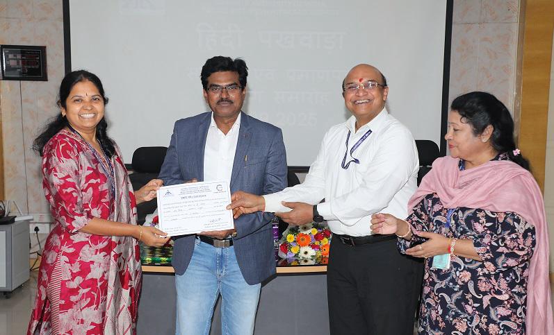 సెప్టెంబర్ 14న రాజ్యాంగ పరిషత్ హిందీకి అధికార భాష హోదా కల్పించిందని బేగంపేట విమానాశ్రయంలో మంగళ వారం ముగిసిన హిందీ పక్షోత్సవాలలో ఏర్పాటు జనరల్ మేనేజర్ కోఆర్డినేషన్ ఇంచార్జ్ అచింత్ కుమార్ దత్త అన్నారు. బేగంపేట విమానాశ్రయంలో సెప్టెంబర్ 14 నుంచి 29 వరకు హిందీ పక్షోత్సవాలు ఘనంగా నిర్వహించారు మంగళవారం ముగింపు సందర్భంగా సర్టిఫికెట్ ప్రధాన ఉత్సవ కార్యక్రమం నిర్వహించారు ఈ సందర్భంగా హైదరాబాద్ ఎయిర్పోర్ట్ జనరల్ మేనేజర్ కోఆర్డినేషన్ ఇంచార్జ్ అచింత్ కుమార్ దత్త మాట్లాడుతూ ప్రతి సంవత్సరం సెప్టెంబర్ 14వ తేదీని హిందీ దినోత్సవం గా జరుపుకుంటున్నామన్నారు జాతీయ సమైక్యత సమగ్రతను చెక్కుచెదరకుండా ఉంచడంలో హిందీ కృషి ప్రశంసనీయమని ఆయన అన్నారు ఈ సందర్భంగా విజేతలకు శుభాకాంక్షలు తెలియజేశారు కార్యక్రమానికి అతిథిగా హాజరైన హైదరాబాద్ కేంద్రీయ విశ్వవిద్యాలయం ప్రొఫెసర్ డాక్టర్ భగవాన్ గవాడే మాట్లాడుతూ ప్రపంచ స్థాయిలో హిందీ ప్రభావం పెరుగుతుందని నేడు ప్రపంచ దేశాలన్నీ భారత్ కు చేరువయ్యే పోటీలో ఉన్నాయని అలాంటి పరిస్థితిలో హిందీ బాటలు వేస్తుందని చెప్పారు. విమానాశ్రయంలో కొనసాగుతున్న అధికార భాషా పనులను ప్రశంసించారు ఈ కార్యక్రమంలో అవార్డు విజేతలకు ముఖ్య అతిథి చేతుల మీదుగా సర్టిఫికెట్ల ప్రధానం చేశారు కార్యక్రమంలో ఏటీసీ జనరల్ మేనేజర్ గోప కుమార్ ప్రసిల్లా ప్రియా, అపూర్వజైన్ శుక్లా ఉపేంద్ర కుమార్ ,నేతా సురేష్ తదితరులు పాల్గొన్నారు.