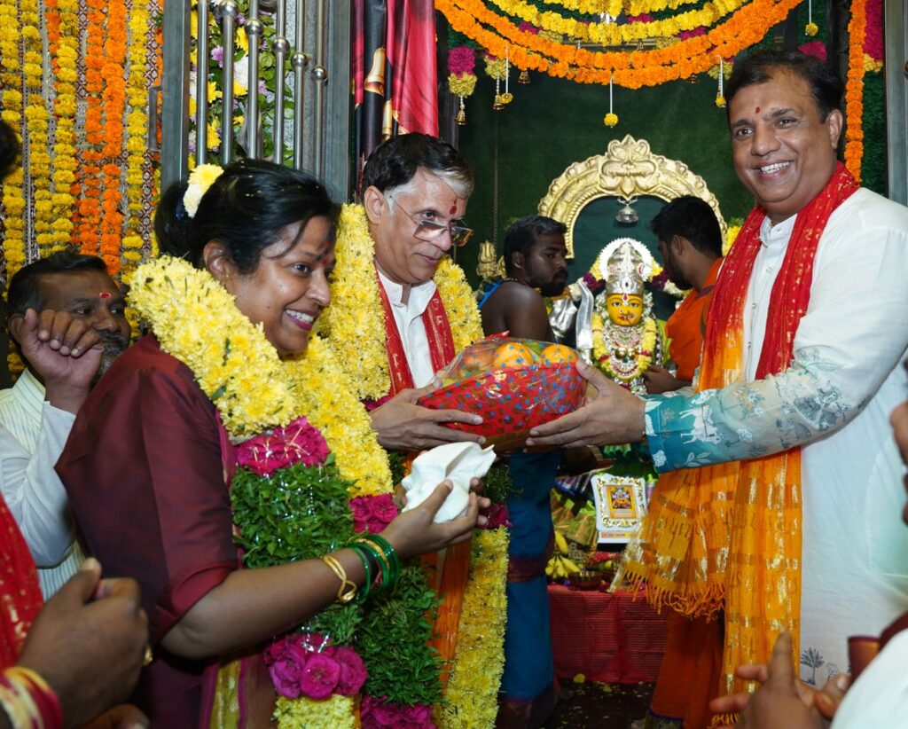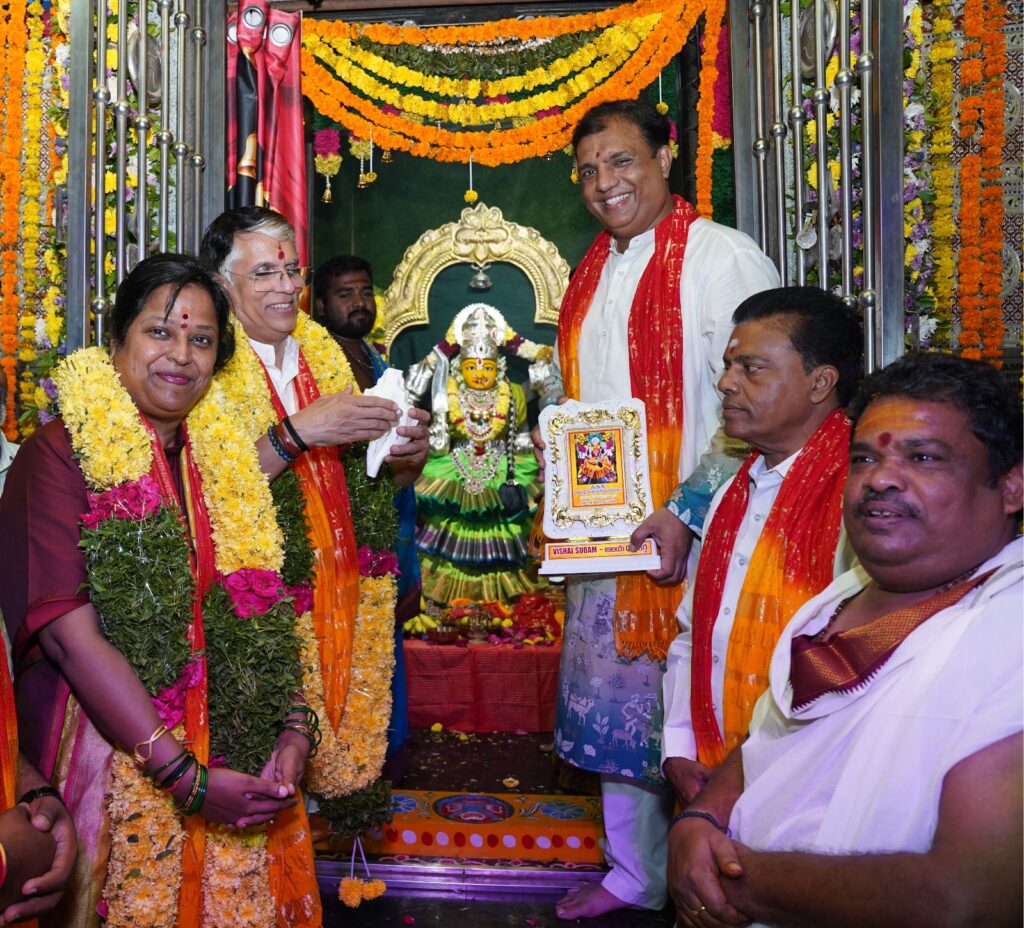 దసరా శరన్నవ రాత్రి ఉత్సవాలలో భాగంగా గురువారం బేగంపేట ప్రకాశం నగర్ లోని శ్రీ భూలక్ష్మీ దేవాలయంలో ఏ ఐ సి సి మీడియా అండ్ పబ్లిసిటీ చైర్మన్ పవన్ కేరా, టీ పీ సి సి ఉపాధ్యక్షురాలు కోట నీలిమలు అమ్మవారిని దర్శించుకుని పూజలు నిర్వహించారు.ఈ సందర్భంగా ఆలయ ధర్మకర్త విశాల్ సుధాం వారిని ఆహ్వానించి పూజలు నిర్వహింప జేశారు.వారిని శాలువాలు,పూల మాలలతో ఘనంగా సత్కరించారు.అమ్మవారి చిత్ర పటాలను బహుకరించారు. ఈ కార్యక్రమంలో విశాల్ సుధాం తో పాటు త్రికాల మనోజ్ ,చిరంజీవి,అర్చకులు మఠం సదాశివుడు,తదితరులు పాల్గొన్నారు.