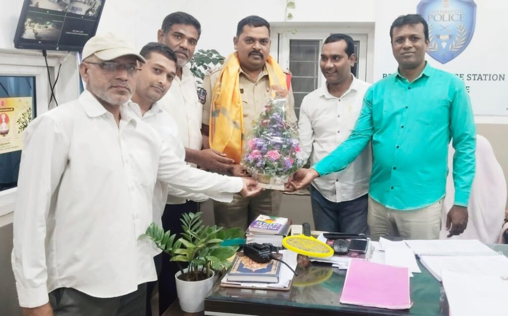 బేగంపేట పోలీస్ స్టేషన్ ఎస్ హెచ్ ఓ గా ఇటీవల బాధ్యతలు స్వీకరించిన ఇన్స్పెక్టర్ పి.సైదులు ను బేగంపేట డివిజన్ కాంగ్రెస్ నాయకులు నసీరుద్దీన్ (అడ్డూ)ఆధ్వర్యంలో సోమవారం సాయంత్రం కలిశారు. ఈ సందర్భంగా బొకే,శాలువా తో సత్కరించారు.అభినందనలు తెలియజేసారు.ఇన్స్పెక్టర్ ను కలిసి అభినందనలు తెలియ జేసిన వారిలో అడ్డూ తో పాటు సిద్దిక్ ఖాన్, అయూబ్,షేక్ సిద్ధికి ,ఇలియాస్ తదితరులు ఉన్నారు. ఈ సందర్భంగా ఇన్స్పెక్టర్ సైదులు మాట్లాడుతూ శాంతి భద్రతల విషయంలో ప్రజల సహాకారం ఎంతో అవసరమని,అన్నారు.ప్రజల సహకారం తో బేగంపేట డివిజన్ ను ప్రశాంతంగా ఉంచేందుకు కృషి చేస్తానని అన్నారు.