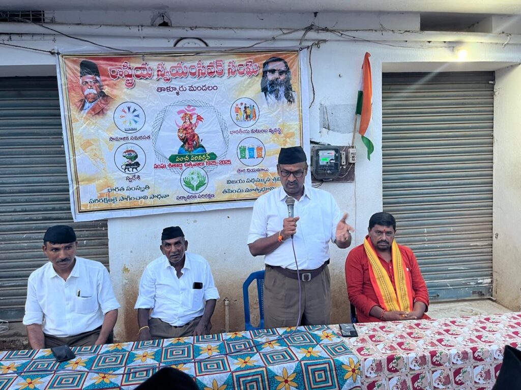 హిందూ సమాజాన్ని ఏకంచే సి క్రమశిక్షణను పెంపొందింటం రాష్ట్రీయ సేవక్ సంఘ్ (ఆర్ఎస్ఎస్) లక్ష్యంఅని ఆర్ఎస్ఎస్ ప్రముక్ తిరుపతయ్య తెలిపారు. తాళ్లూరులో బస్టాండ్ సెంటర్లో ఆర్ఎస్ఎస్ వందసంవత్సరాల వేడుకలు బుధ వారం సాయంత్రం ఘనంగా నిర్వంచారు. ఈ సందర్భంగా తిరుపతయ్య మాట్లాడుతూ హిందూ భావ జాలాన్ని వ్యాప్తి చేయటం, భారతీయ సంస్కృతిని, నాగరికత స్వయం విలువలను నిలబెట్టి ఆదర్శంగా నిలవాలన్నదే ఆర్ఎస్ఎస్ లక్ష్యమన్నారు. స్వాతంత్ర్య అనంతరం ప్రభావంతమైన హిందూ సంస్థగా ఆర్ఎస్ ఎస్ ఎదిగిందన్నారు. ఆర్ఎస్ఎస్ సైద్దాంతికత విశ్వాసాలను దేశ వ్యాప్తంగా వ్యాప్తి చేయటానికి అనేక పాఠశాలలు, స్వశ్చంద సంస్థలు, అనేక అనుబంధ సంస్థలు ఏర్పడ్డాయన్నారు.