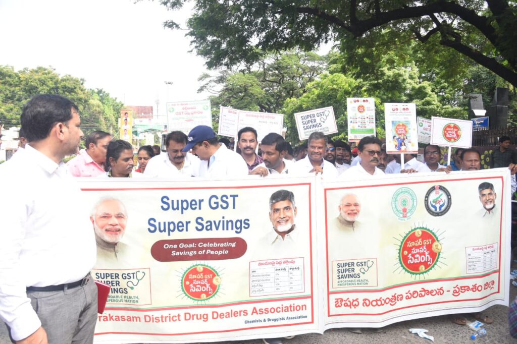 పై అవగాహనా పెరుగుతుందని, పొగాకు కూల్డ్రింక్స్ పై అధిక పన్ను ఉంటుందని, ద్రుష్టి సరిచేసి కల్లద్ధాల ధరలు తగ్గుతాయని, కాన్సర్ వ్యాధి మందుల ధరలు తగ్గుతాయని, వ్యాధి నిర్ధారణ కిట్లుపరికరాల ధరలు తగ్గుతాయని, మెడికల్ గ్రేడ్ ఆక్షిజన్ ధరలు తగ్గుతాయని తెలియజేయడంజరిగినది అదనపు డ్రగ్ కంట్రోలర్ పి.ఎస్. జ్యోతి జి.ఎస్.టి. వలన ప్రాణ రక్షక మందుల ధరలు తగ్గుతాయని, సాధారణ మందులు 12% నుండి 5% తగ్గుతాయని,తెలిపారు కార్యక్రమములో డ్రగ్ ఇన్స్పెక్టర్ పి. శ్రీరామమూర్తి, డి కృష్ణారెడ్డి, కార్యదర్శి వేముల సుబ్బారావు , ఒంగోలు రిటైల్ షాప్ అద్యక్షులు జి వెంకటరెడ్డి హోల్సెల్ అద్యక్షులు అంకిరెడ్డి పిసిడి అసోసే షాన్ అద్యక్షులు వి వెంకటరావు , వైద్య ఆరోగ్యశాఖా తరుపన డిసిహెచ్ఎస్ డాక్టర్ యమ్ శ్రీనివాస నాయిక్, ప్రోగ్రాం ఆఫీసర్ డాక్టర్ సూరిబాబు, ఆర్ బి ఏ కె నోడల్ అధికారి డాక్టర్ భాగీరధి , జిల్లా మిడియా అధికారి బెల్లం నరసింహ రావు , ఇన్చార్జి మాస్ మీడియా అధికారి శ్రీనివాసరావు, డిప్యూటీ డెమో యమ్ .సరోజినీ హెల్ప్ స్వచ్ఛందసంస్థ పి డి బివి సాగర్ మరియు నర్సింగ్ విద్యార్ధులు, అధ్యాపకులు, పట్టణ ఆరోగ్యకేంద్రముల ఆరోగ్యకార్యకర్తలు, పర్యవేక్షకులు, ఆషా లు పాల్గొన్నారు.