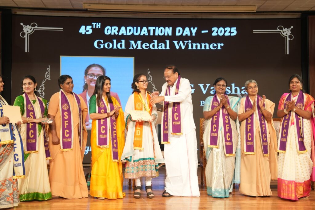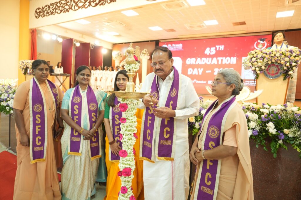 విద్య ద్వారా మహిళలు సాధికారిత దిశగా అడుగులు వేయవచ్చని భారత మాజీ ఉప రాష్ట్ర పతి ముప్పవరపు వెంకయ్య నాయుడు పేర్కొన్నారు.బేగంపేట సెయింట్ ఫ్రాన్సిస్ కాలేజీ ఫర్ ఉమెన్ 45వ పట్టభద్రుల దినోత్సవాన్ని ఘనంగా నిర్వహించింది.ఈ కార్యక్రమానికి వెంకయ్య నాయుడు ముఖ్య అతిథిగా హాజరయ్యారు.అతిథిగా ఐ పి ఎస్ అధికారి దీపాలి మసీర్కర్ పాల్గొన్నారు.ఈ సందర్భంగా ముఖ్య అతిథి వెంకయ్య నాయుడు మాట్లాడుతూ తల్లి దండ్రుల భాషను కాపాడు కోవడం,భారత దేశం విశ్వ గురువుగా వున్న ఘనతను,యువ శక్తి వలన సాధించే అవకాశాలను వివరించారు.మొదట 15మందితో ప్రారంభ మైన ఈ కళాశాల ప్రస్తుతం 3495 విద్యార్ధులతో అభివృద్ధి చెందిందన్నారు.తల్లి దండ్రులు గురువులను ఆదరించండి అంటూ ఆయన పిలుపు నిచ్చారు.గౌరవ అతిథి దీపాలీ మసీర్కర్ మాట్లాడుతూ కళాశాల మూలాలను గౌరవించాలని అన్నారు.నేర్చుకోవడం ఎప్పటికీ అపవద్దని అన్నారు.ఇంకా ఈ కార్యక్రమంలో కే.శశికాంత్,రమాదేవి లంకా తదితరులు పాల్గొన్నారు.ఈ పట్ట బద్రుల వేడుకలో మొత్తం 981 మంది విద్యార్థులు పట్ట బద్రుల ధృవీకరణ ను పొందారు.ఆర్ట్స్ విభాగంలో. ఉమైమా బజాజ్ మూడు బంగారు పతకాలు అందుకోగా,కామర్స్ విభాగంలో నాంపల్లి సుప్రియ ,వర్షా,సైన్స్ విభాగం లో బి.అశ్వినీ నాలుగు బంగారు పతకాలు అందుకున్నారు.