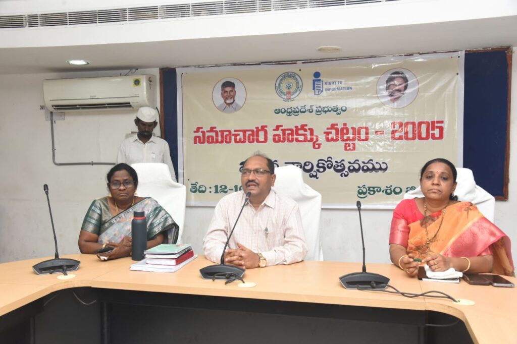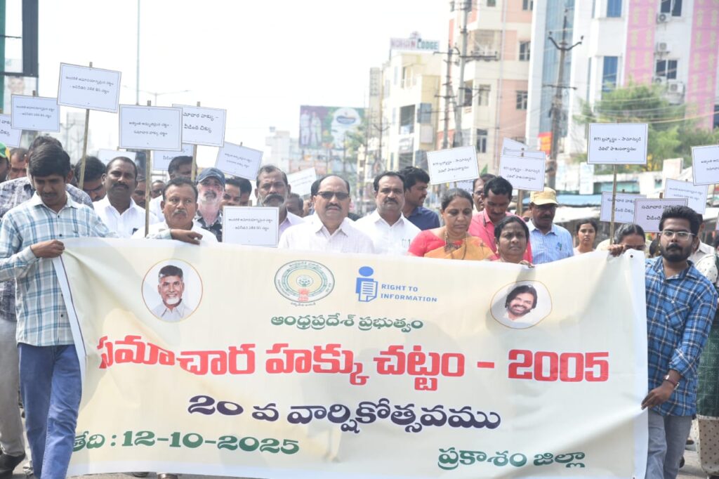 సమాచార హక్కు చట్టం 20వ వార్షికోత్సవాన్ని పురస్కరించుకుని ఆదివారం ఒంగోలులో ర్యాలీ, సమావేశం నిర్వహించారు. జిల్లా రెవెన్యూ అధికారి చిన ఓబులేషు ఆధ్వర్యంలో ఒంగోలు కలెక్టర్ కార్యాలయం నుంచి నెల్లూరు బస్టాండ్ మీదుగా చర్చి సెంటర్ వరకు ర్యాలీ నిర్వహించారు. అనంతరం కలెక్టర్ కార్యాలయంలోని సమావేశ మందిరంలో సమాచార హక్కు చట్టంపై అవగాహన సమావేశం నిర్వహించారు. ఈ సందర్భంగా జిల్లా రెవెన్యూ అధికారి చిన ఓబులేషు మాట్లాడుతూ… సమాచర హక్కు చట్టం అమలులోనికి వచ్చి 20 సంవత్సరాలు పూర్తి అయిన సందర్బంగా ప్రజలకు అవగాహన కల్పించే లక్ష్యంతో ర్యాలీ, సమావేశం నిర్వహించడం జరిగిందన్నారు. సమాచార హక్కు చట్టం ద్వారా ప్రజలు అడిగిన సమాచారాన్ని అధికారులు అందించాలన్నారు. ప్రజలు సమాచార హక్కు చట్టాన్ని సద్వినియోగం చేసుకుని అవసరమైన సమాచారాన్ని పొందవచ్చునని తెలిపారు.