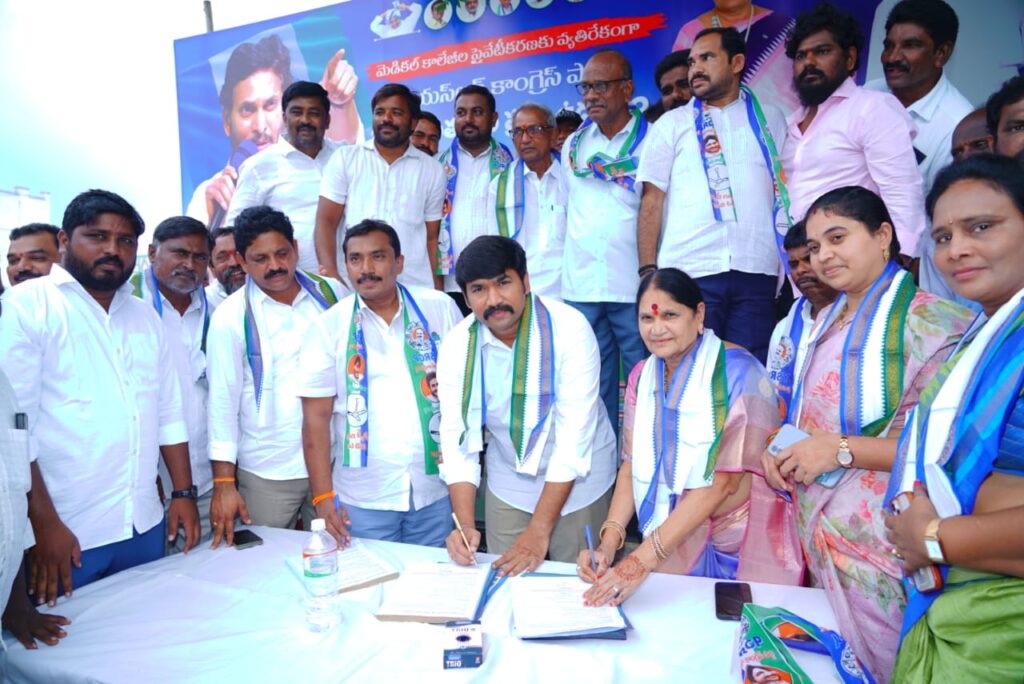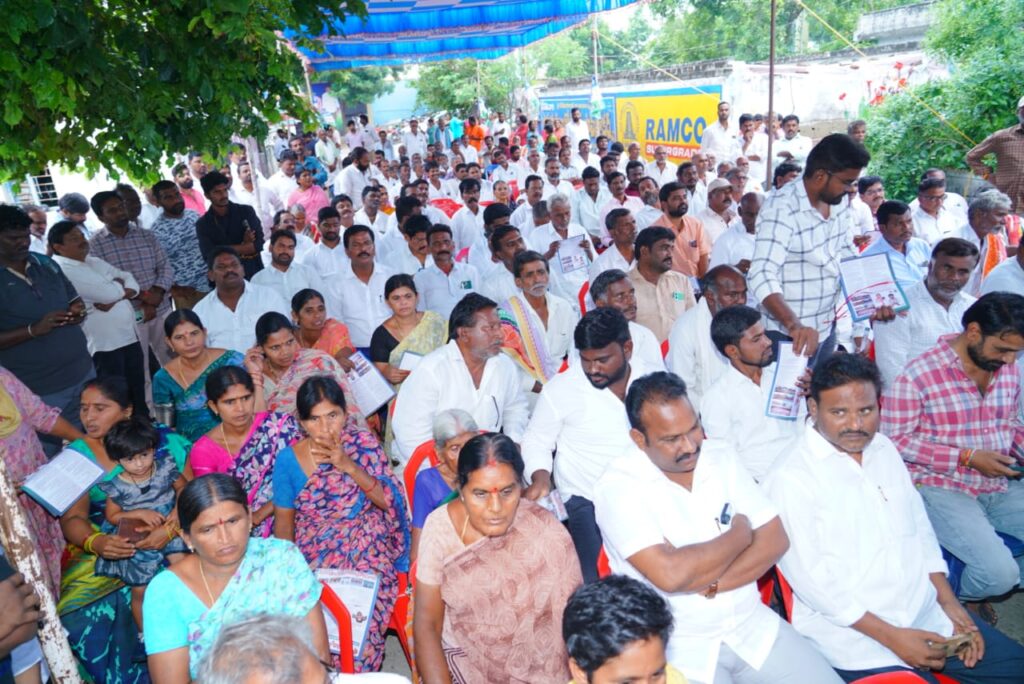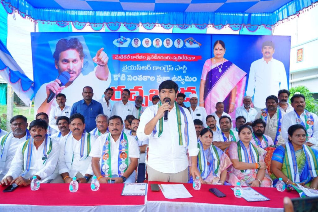ప్రభుత్వ మెడికల్ కాలేజీ లను పీపీపీ పద్దతి లో ప్రవేటు కి కట్టబెట్టడానికి కూటమి ప్రభుత్వం చేస్తున్న చర్యలకు నిరసనగా రాష్ట్ర వ్యాప్తంగా వైఎస్ఆర్ కాంగ్రెస్ పార్టీ ఆద్వర్యంలో కోటి సంతకాల సేకరణ రచ్చబండ కార్యక్రమం ద్వారా ప్రతి గ్రామంలో సేకరించి గవర్నర్ కి అందించే కార్యక్రమం చేస్తున్నట్లు ప్రకాశం జిల్లా వైఎస్ఆర్ కాంగ్రెస్ పార్టీ అధ్యక్షులు , దర్శి ఎమ్మెల్యే డాక్టర్ బూచేపల్లి శివప్రసాద్ రెడ్డి అన్నారు. దర్శి మండలం కొత్త రెడ్డి పాలెం గ్రామంలో గురువారం రచ్చబండ కార్యక్రమం నిర్వహించారు. ఈ సందర్భముగా వైసిపి జిల్లా పార్టీ అధ్యక్షుడు , దర్శి ఎమ్మెల్యే డాక్టర్ బూచేపల్లి శివప్రసాద్ రెడ్డి మాట్లాడుతూ… రాష్ట్రం లో వైఎస్ జగన్ మోహన్ రెడ్డి ముఖ్యమంత్రి గా వున్నప్పుడు 17 మెడికల్ కాలేజీ లు నిర్మాణం చేపట్టి 5 కాలేజీ లు నిర్మాణం పూర్తి చేసి ఆసుపత్రులను లను కూడా ప్రారంభించడం జరిగినదని అన్నారు. చంద్రబాబు 15 సంవత్సరాలు అధికారం లో ఉంటే ఒక్క మెడికల్ కాలేజీ అయిన కట్టారా అని ప్రశ్నించారు. పేద విద్యార్ధులకు మెడికల్ విద్యను దూరం చేయడానికి కూటమి ప్రభుత్వం ప్రయత్నిస్తుంది అన్నారు. పేద బడుగు బాలహీన వర్గాల ప్రజలకు వైద్యం అందించాలి అని వైయస్ జగన్మోహన్ రెడ్డి ముందు చూపుతూ మెడికల్ కాలేజీ నిర్మాణం చేపట్టారు అని అన్నారు. ప్రభుత్వం మెడికల్ కాలేజీలు ప్రవేటు పరం అయితే పేదవాడికి వైద్యం అందని ద్రాక్షగా మారుతుంది అన్నారు. దివంగత సీఎం వైఎస్ రాజశేఖర్ రెడ్డి ప్రకాశం జిల్లా లో రిమ్స్ మెడికల్ కాలేజీ నిర్మించి ఎంతో మంది పేద విద్యార్ధులకు వైద్య విద్య అందించడమే కాకుండా ప్రజలకు వైద్యం అందేలా కృషి చేశారని గుర్తు చేశారు. ముఖ్యమంత్రి గా వైఎస్ జగన్మోహన్ రెడ్డి పాలనలో 104,108 పథకాలు మెరుగైనవిగా తయారు చేశారని అన్నారు.ఆరోగ్య శ్రీ మరియు ఆరోగ్య రక్ష వంటి పథకాలతో రాష్ట్ర వ్యాప్తంగా వైద్యం సేవలు ప్రజలకు అందుబాటులో ఉంచారని అన్నారు.కార్పొరేట్ వైద్యాన్ని కూడా పేద ప్రజలకు అందుబాటులోకి తెచ్చిన వ్యక్తి వైఎస్ జగన్మోహన్ రెడ్డి అని అన్నారు. రాష్ట్ర వ్యాప్తంగా మెడికల్ కాలేజీల ప్రైవేటీకరణ వ్యతిరేకంగా జరిగే కోటి సంతకాల సేకరణ లో దర్శి నియోజకవర్గం లో 60 వేల సంతకాలు సేకరించి గవర్నర్ కు పంపించడం జరుగుతుందని అన్నారు. ఈ కార్యక్రమంలో జిల్లా పరిషత్ చైర్ పర్సన్ బూచేపల్లి వెంకాయమ్మ ,రాష్ట్ర కార్యదర్శి బోట్ల రామారావు ,దర్శి, దొనకొండ ,తాళ్లూరు, కురిచేడు, మండల పార్టీ అధ్యక్షులు వెన్నపూస వెంకట రెడ్డి, కాకర్ల కృష్ణా రెడ్డి , టి. వి సుబ్బారెడ్డి , సుబ్బయ్య యాదవ్ , దొనకొండ ఎంపీపీ ఉషా మురళీ,కురిచేడు జడ్పీటీసీ నుసుం నాగిరెడ్డి , దర్శి వైస్ ఎంపీపీ సోము దుర్గా రెడ్డి , జిల్లా ఎస్సీ సెల